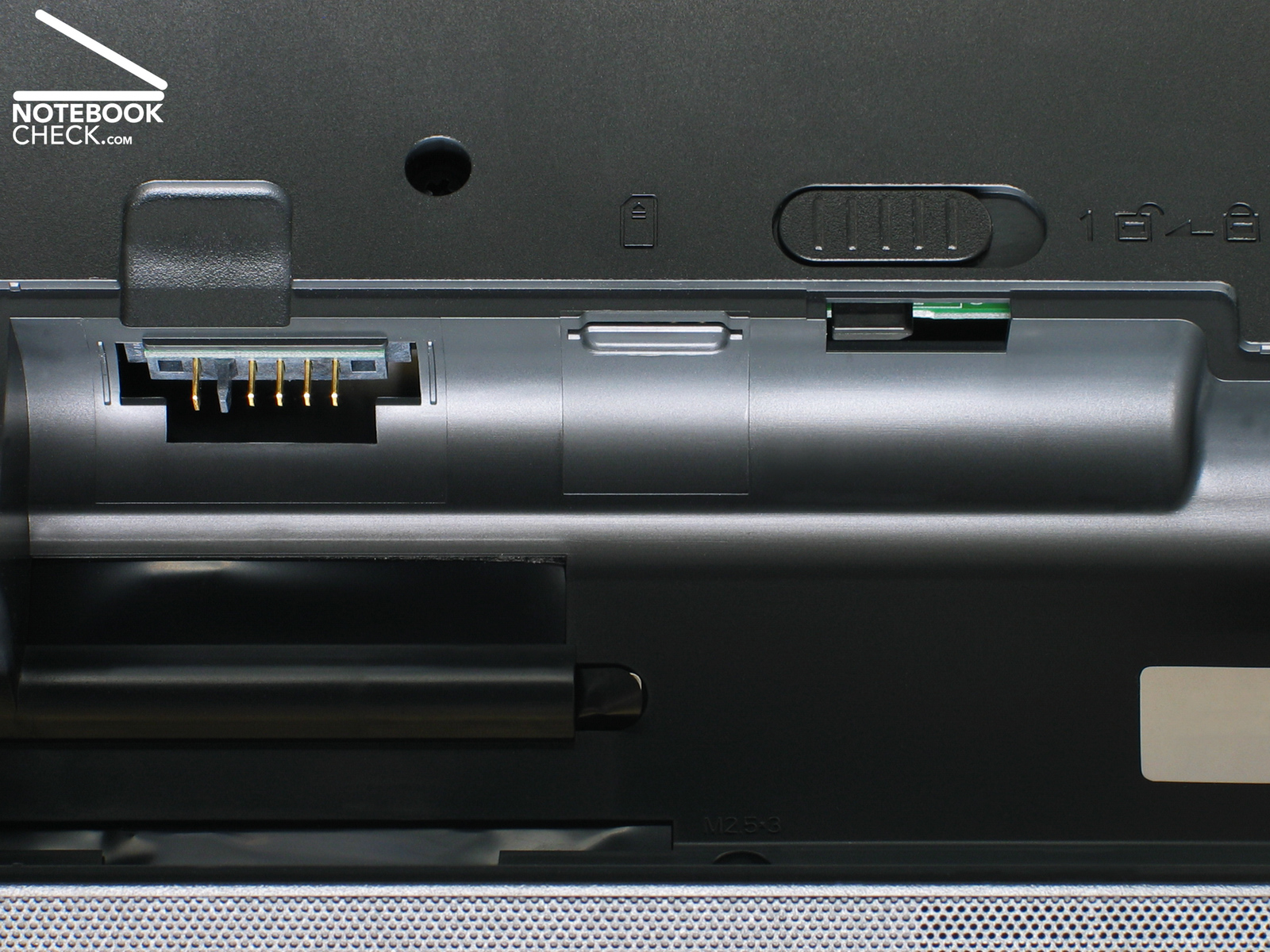 Während bei den Lifebooks in den modularen Schacht für das DVD-Laufwerk stattdessen auch ein zweiter Akku passt, verfügt das M9400 an der Geräteunterseite über einen zusätzlichen Batterieanschluss. Daran kann eine zweite Batterie (S26391-F405-L841) in Keilform angedockt werden. Positiver Nebeneffekt: Das M9400 wird leicht nach vorne zum Anwender hin geneigt positioniert und erlaubt somit entspanntes Schreiben auch längerer Texte. Zudem bietet das M9400 am Geräteboden einen Anschluss für einen optionalen Portreplikator. Damit entfällt zum einen das lästige An- und Abstecken diverser Kabel, zum anderen stellt der Portreplikator zusätzliche Anschlüsse wie DVI-D und PS/2 bereit.