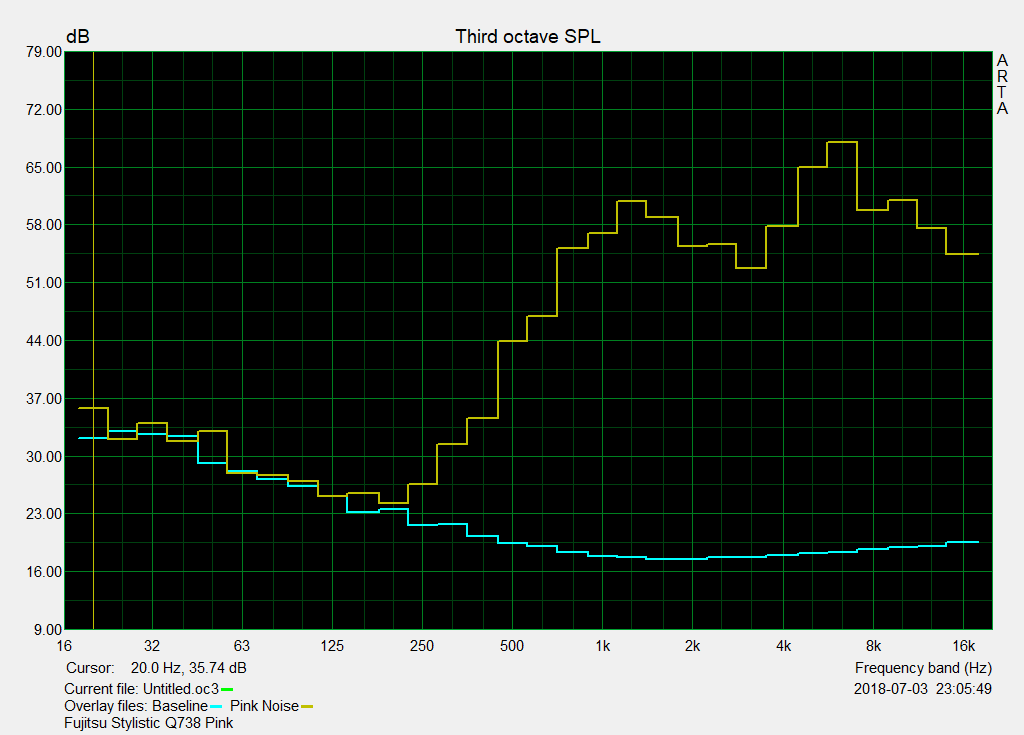 Das Fujitsu Stylistic Q738 ist im Leerlauf nicht zu hören. Auch bei moderater Systembelastung bleiben die Lüfter noch still, geben aber auch unter Last kaum Geräusche von sich. Damit eignet sich das Tablet auch für den Einsatz in sehr ruhigen Umgebungen.
