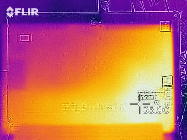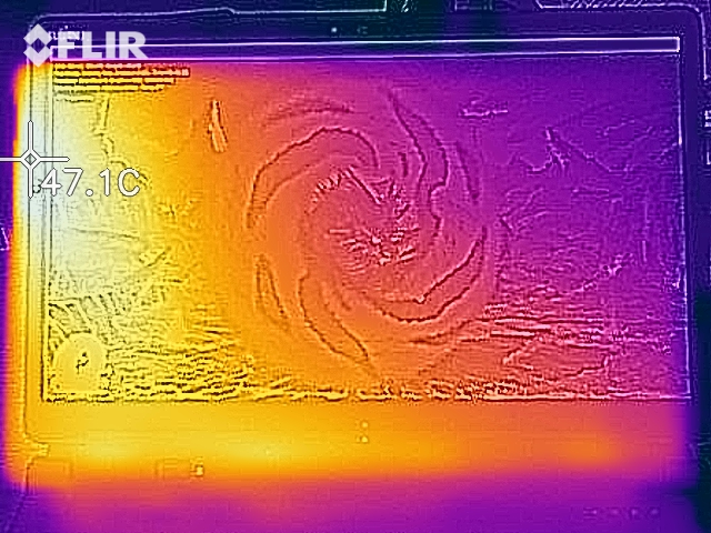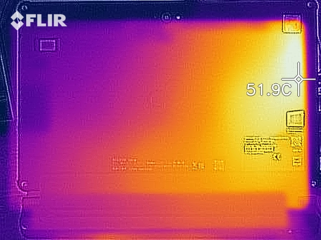 (-) Auf der Unterseite messen wir eine maximalen Wert von 49.2 °C (im Vergleich zum Durchschnitt von 36.8 °C).