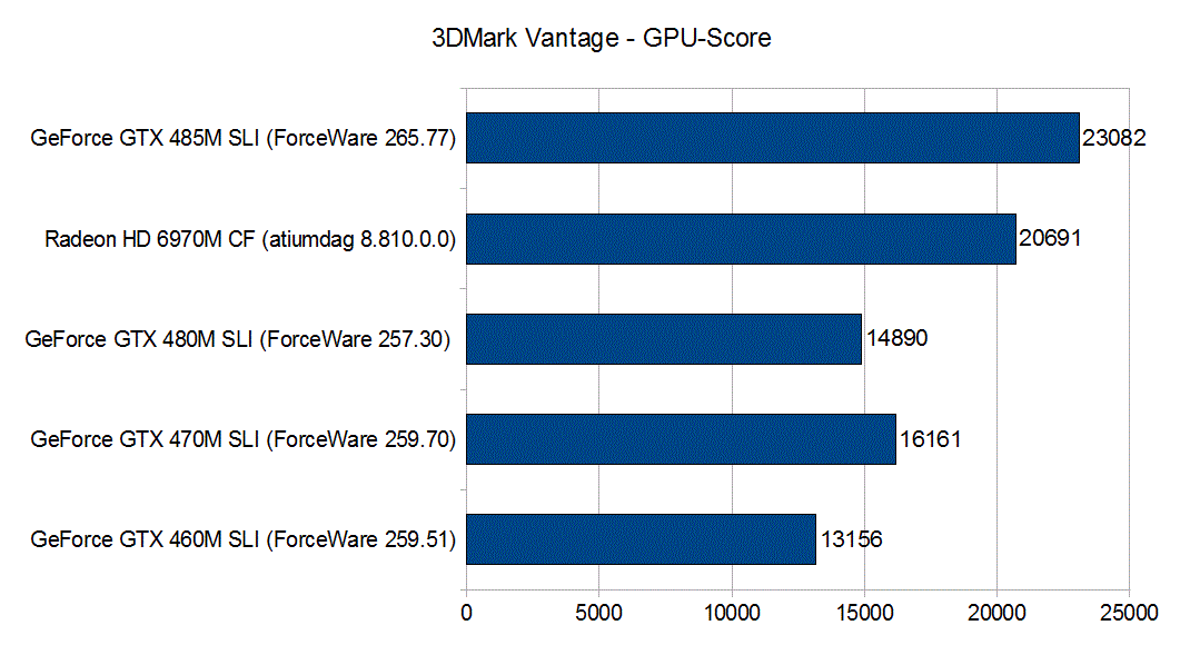 Der GPU-Score des 3DMark Vantage bildet eine gute Basis für einen Grafikkartenvergleich. Die Standardeinstellung (1280 x 1024) wurde sowohl von der GeForce GTX 485M SLI als auch von der Radeon HD 6970M CF hervorragend gemeistert. Mit 23082 zu 20691 Punkten hat die SLI-Lösung um 12% die Nase vorne. Die restlichen Dual-GPU-Konfigurationen folgen in gehörigem Abstand, die GeForce GTX 470M SLI muss sich beispielsweise mit 16161 Punkten zufrieden geben.