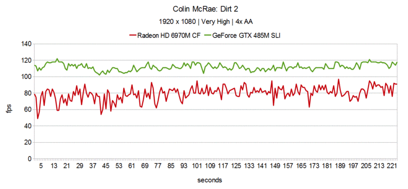 Ähnlich wie bei Need for Speed: Shift sind auch in Colin McRae: Dirt 2 Grafikkarten von Nvidia im Vorteil. Während es sich die GeForce GTX 485M SLI mit 114.3 fps auf dem Thron gemütlich macht, ordnet sich die Radeon HD 6970M CF mit 80.3 fps zwischen GeForce GTX 460M SLI (75.4 fps) und GeForce GTX 470M SLI (93.0 fps) ein.