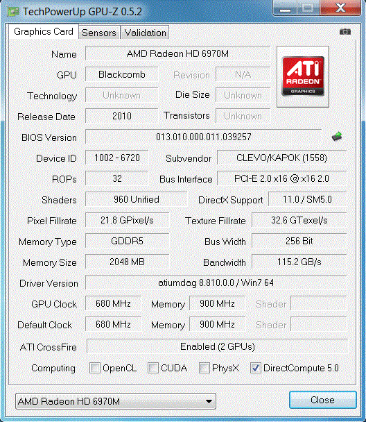 AMDs Gegenentwurf zu Nvidias SLI nennt sich CrossFire. Zwei Radeon HD 6970M-GPUs stellen momentan die Speerspitze von AMDs Portfolio dar. Die DirectX 11 fähige und im modernen 40 nm Verfahren produzierte Radeon HD 6970M hört auf den schicken Codenamen Blackcomb XT und ist mit 960 Unified Shadern (nicht direkt mit Nvidia vergleichbar) ausgestattet. Die Taktraten können sich durchweg sehen lassen, 680 MHz (Kern) und 900 MHz (Speicher) sind relativ viel. Wie bei der GeForce GTX 485M ist auch der Videospeicher der Radeon HD 6970M üppige 2048 MByte groß (GDDR5), das Interface beträgt wiederum 256 Bit.