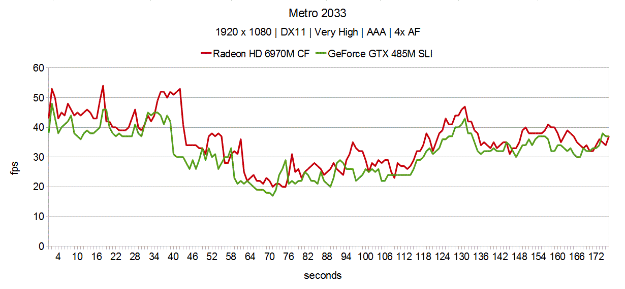 Mit GeForce GTX 485M SLI oder Radeon HD 6970M CF ruckelt Metro 2033 zwar immer noch streckenweise, durchschnittlich 31.4 respektive 35.3 fps verdienen dennoch gehörigen Respekt, wobei die AMD-GPUs ein Plus von 12% für sich verbuchen können. Als wesentlich langsamer offenbaren sich GeForce GTX 470M SLI und GeForce GTX 460M SLI, 23.0 bzw. 18.5 fps genügen nicht ansatzweise zum Zocken.