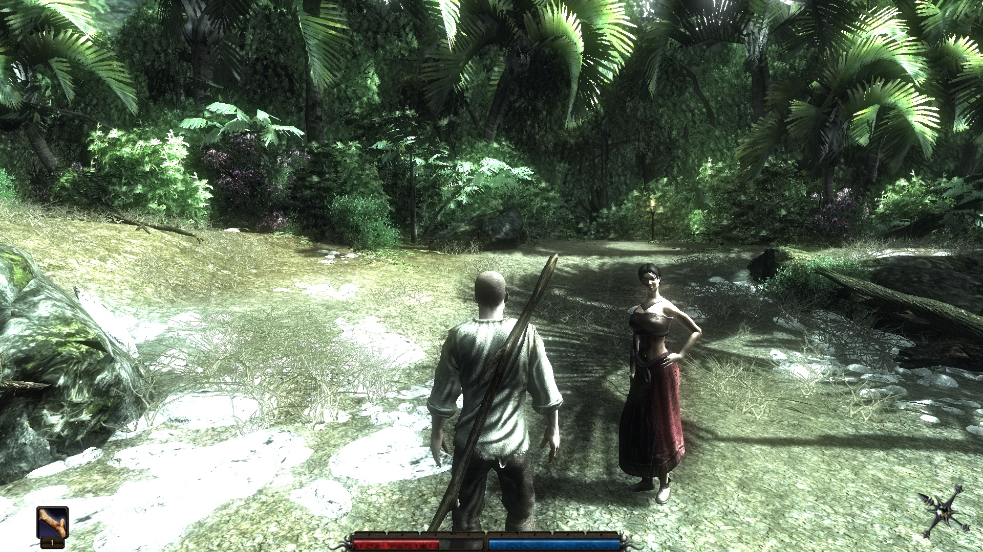 Wer Rollenspiele mit offenen und frei zugänglichen Welten schätzt, dürfte an Risen seinen Gefallen finden. In vielerlei Hinsicht mag der deutsche Third-Person-Titel inzwischen etwas antiquiert wirken, die tolle Atmosphäre, die authentische Landschaftsgestaltung und die gelungene Charakterentwicklung lassen den ein oder anderen Mangel aber schnell vergessen. Für unseren Benchmark haben wir die kostenlose Demoversion verwendet, in der wir direkt nach Spielstart für einige Minuten den Strand unsicher machten.