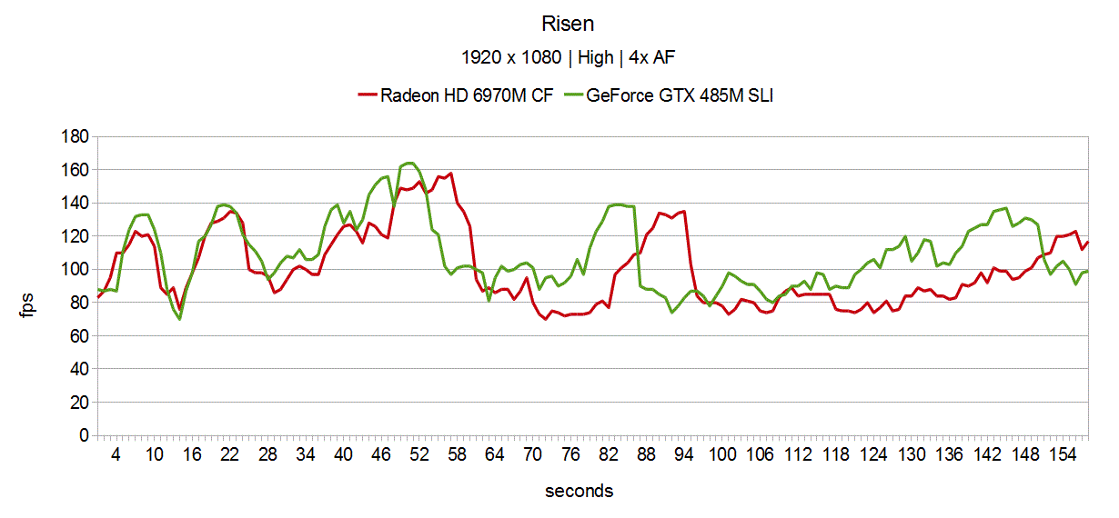 1920 x 1080 Bildpunkte, hohe Details und 16x anisotrope Filterung wurden von allen Dual-GPU-Konfigurationen problemlos geschultert. Angefangen bei GeForce GTX 460M SLI (63.5 fps) und GeForce GTX 470M SLI (81.8 fps), die sich schon tadellos zum gepflegten Monsterschnetzeln eignen. AMDs Radeon HD 6970M CF legt mit 101.2 fps nochmals eine gehörige Schippe drauf. Die Spitzenposition wird in Risen von der GeForce GTX 485M SLI eingenommen, 109.1 fps sind unser derzeitiger Referenzwert.