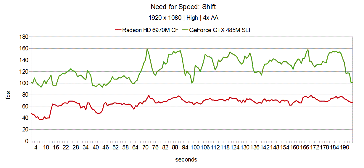 Die Radeon HD 6970M CF machte in Shift keine gute Figur. Mit 66.2 fps wird sie sowohl von der GeForce GTX 460M SLI (81.6 fps) als auch von der GeForce GTX 470M SLI (102.7 fps) überrundet. Gegen die GeForce GTX 485M SLI sieht es sogar ganz düster aus, 126.0 fps repräsentieren ein Plus von immensen 90%.