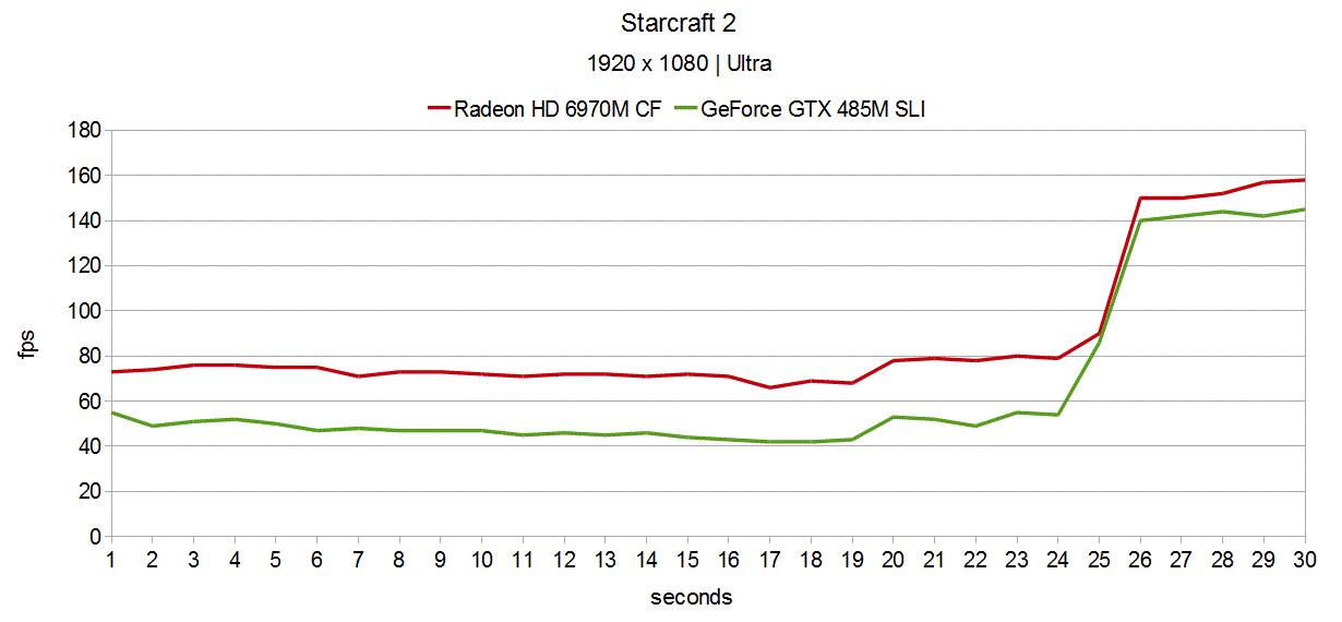 Im Gegensatz zu den vorherigen Titeln fällt Starcraft 2 deutlich zugunsten von CrossFire aus. So ist die Radeon HD 6970M CF dazu in der Lage, die GeForce GTX 485M SLI um beachtliche 34% zu überholen (88.6 fps gegen 65.9 fps). GeForce GTX 470M SLI (50.3 fps) und GeForce GTX 460M SLI (40.8 fps) sehen neben der Radeon HD 6970M CF ebenfalls alt aus.