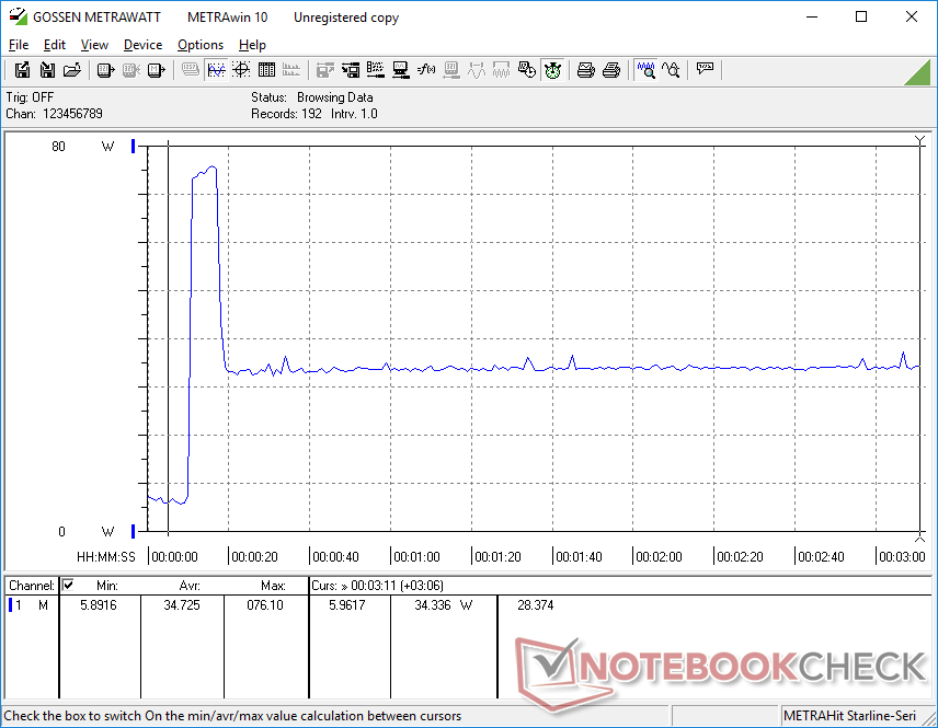 Im Leerlauf auf dem Desktop werden auf der niedrigsten Helligkeitsstufe ungefähr 5 W und auf der höchsten bis zu 13 W verbraucht. Die Differenz ist mit 8 W größer als bei einem handelsüblichen Ultrabook, da das Getac-Display deutlich heller werden kann.