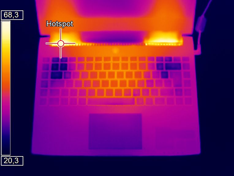 (+) Die Handballen und der Touchpad-Bereich erreichen maximal 34.5 °C und damit die typische Hauttemperatur und fühlen sich daher nicht heiß an.
