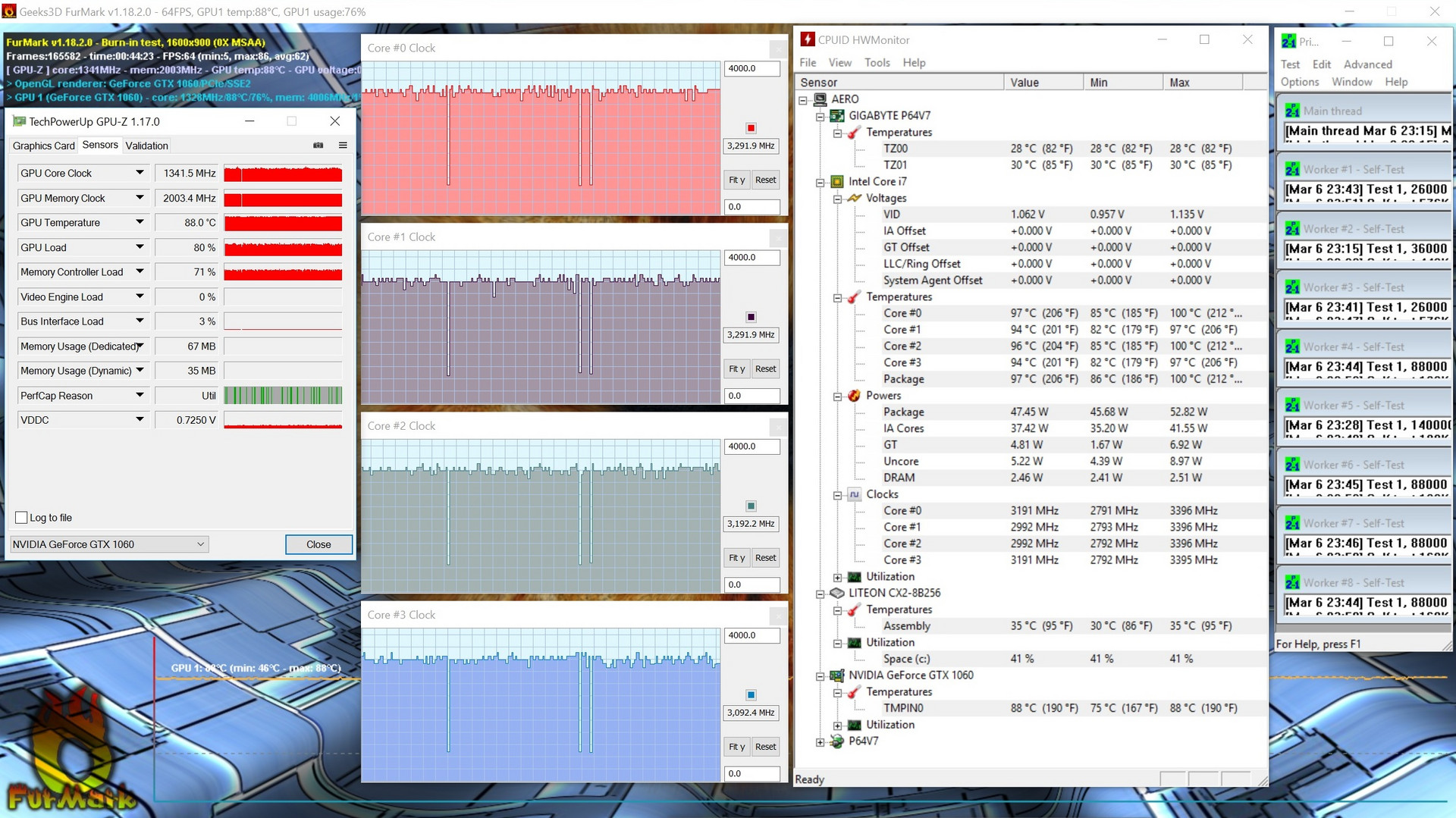 Im Idle-Betrieb kommt das Aero 14 nur auf wenige Grad Celsius über Raumtemperatur. Beim Spielen (Witcher 3, siehe oben) können es an der Unterseite schon bis zu 54 °C werden, was die meisten Leute vom Zocken mit dem Notebook auf dem Schoß abhalten dürfte. Der Bereich der Handballenauflage kommt selbst im Stresstest kaum über Körpertemperatur hinaus. Das Taktverhalten und die Temperaturen von CPU und GPU bei maximaler Last kann man dem Screenshot unten entnehmen.