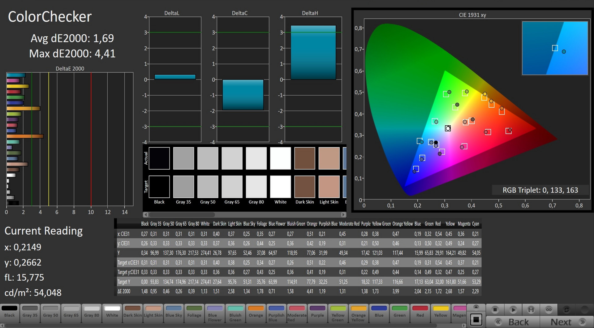 | Colorchecker dE 2000 max. * | 8.68 | 7.34 15% | 8.57 1% | 3.23 63% |