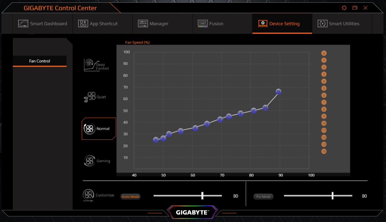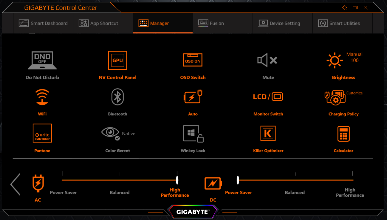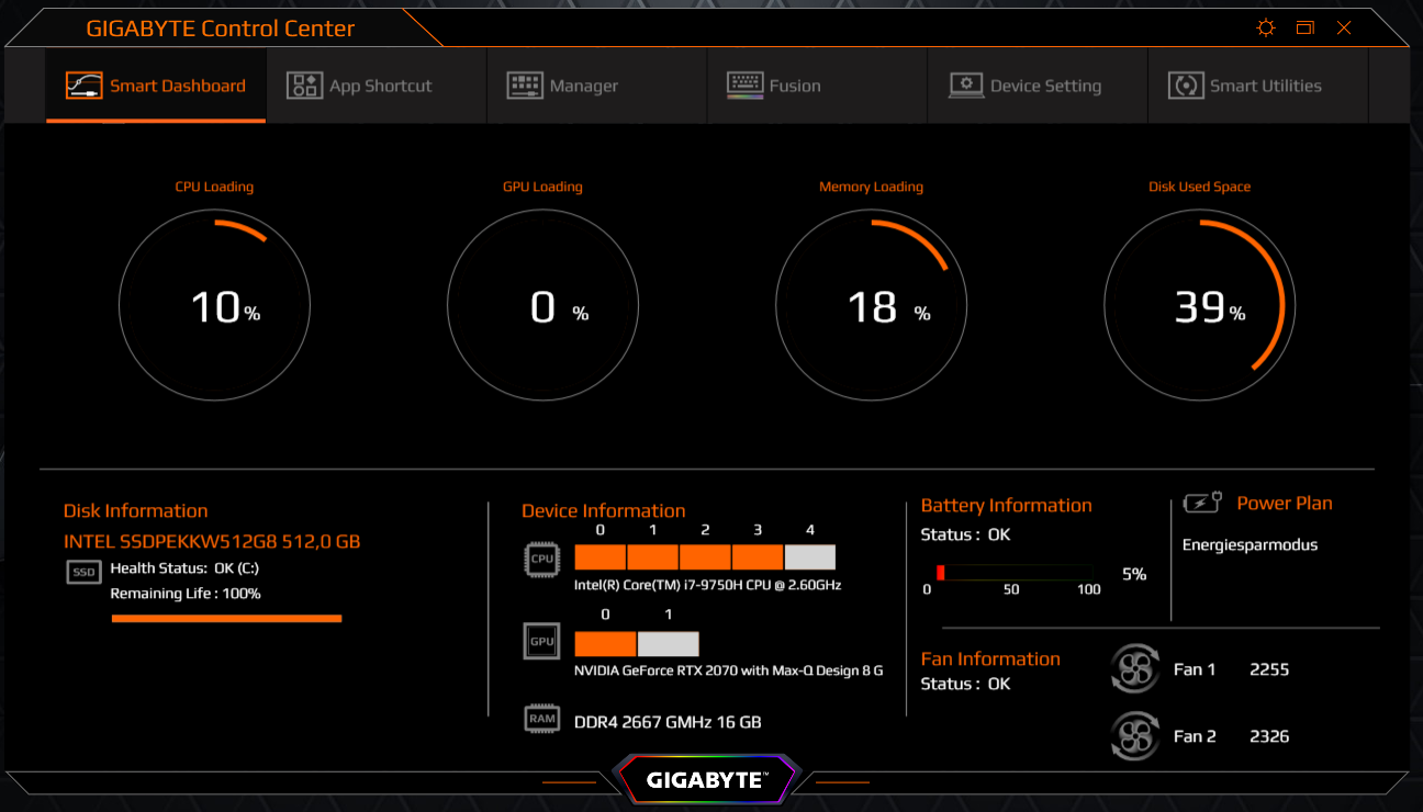 Das vorinstallierte Gigabyte Control Center bietet u. a. die Möglichkeit, ein Energieprofil festzulegen. Wir nutzen hier die Option "Auto" (mit aktiver AI-Funktion). In der Folge wählt das Control Center die passenden Einstellungen selbst. Lediglich zur Durchführung unserer Laufzeittests verwenden wir die Windows eigenen Energieprofile.