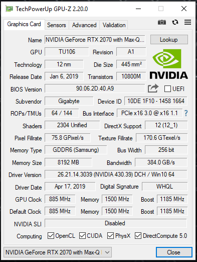 | Gigabyte Aero 15 Classic-XA i7-9750H, GeForce RTX 2070 Max-Q | Gigabyte Aero 15-X9 i7-8750H, GeForce RTX 2070 Max-Q | Razer Blade 15 RTX 2070 Max-Q i7-8750H, GeForce RTX 2070 Max-Q | Asus Zephyrus S GX531GX i7-8750H, GeForce RTX 2080 Max-Q | Schenker XMG Neo 15 Turing i7-8750H, GeForce RTX 2070 Max-Q | Acer Predator Triton 500 i7-8750H, GeForce RTX 2080 Max-Q | Lenovo Legion Y740-15ICHg i7-8750H, GeForce RTX 2070 Max-Q | |