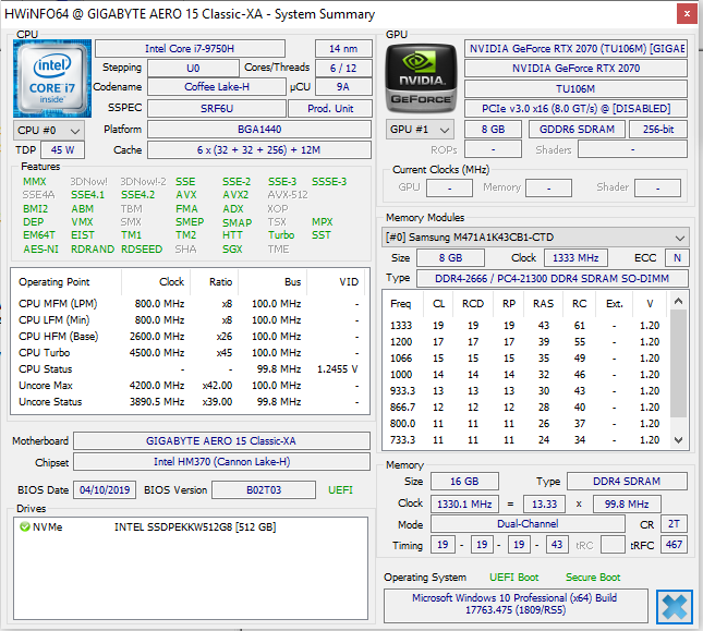 Test Gigabyte Aero 15 Classic-XA (i7-9750H, RTX 2070 Max-Q) Laptop