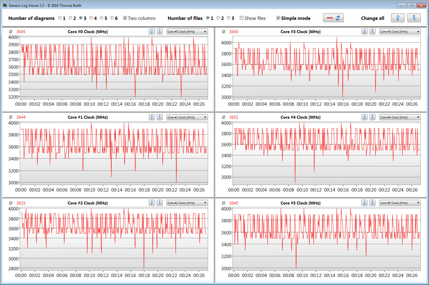 Die Multi-Thread-Tests der Cinebench-Benchmarks bearbeitet der Prozessor mit 3,5 bis 3,9 GHz. Die Single-Thread-Tests werden mit 3,9 bis 4,1 GHz durchlaufen. So weit das Verhalten im Netzbetrieb. Im Akkubetrieb geht die CPU mit 1,7 GHz zu Werke.