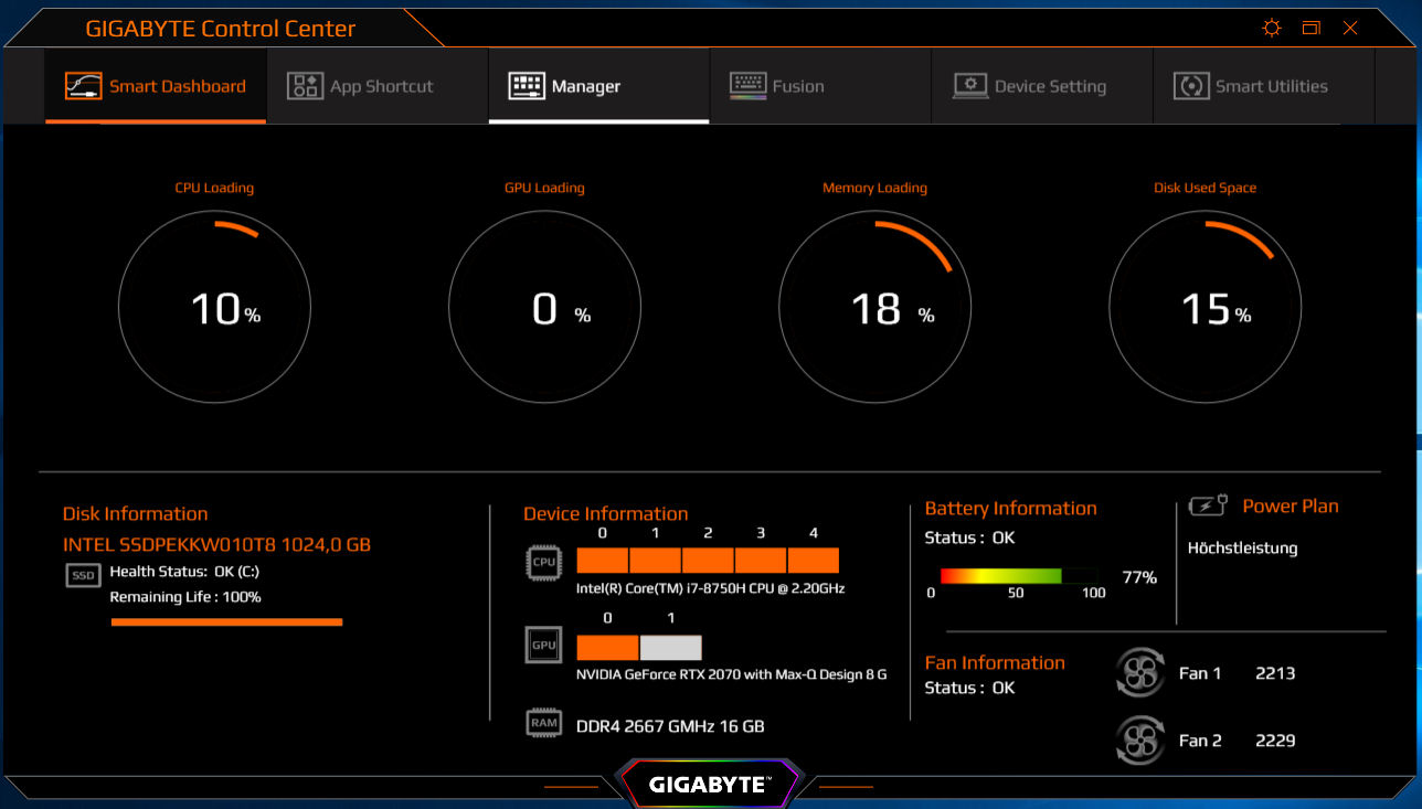 Überraschungen auf Seiten der CPU offenbart das Aero nicht. Auch dieses Gaming-Notebook wird von einem Intel-Core-i7-8750H-Sechskern-Prozessor (Coffee Lake) angetrieben. Der 8750H bietet einen guten Kompromiss aus Rechenleistung und Energiebedarf und stellt somit die erste Wahl für ein mobiles Gaming-Notebook dar. Der Prozessor verfügt über eine TDP von 45 Watt, Gigabyte erlaubt aber eine kurzzeitige Anhebung auf bis zu 70 Watt. Der Core i7 arbeitet mit einer Basisgeschwindigkeit von 2,2 GHz. Per Turbo kann der Takt auf 3,9 GHz (sechs Kerne), 4 GHz (vier Kerne) bzw. 4,1 GHz (ein Kern/zwei Kerne) gesteigert werden.