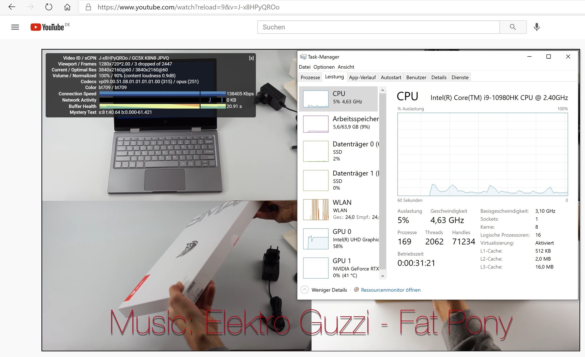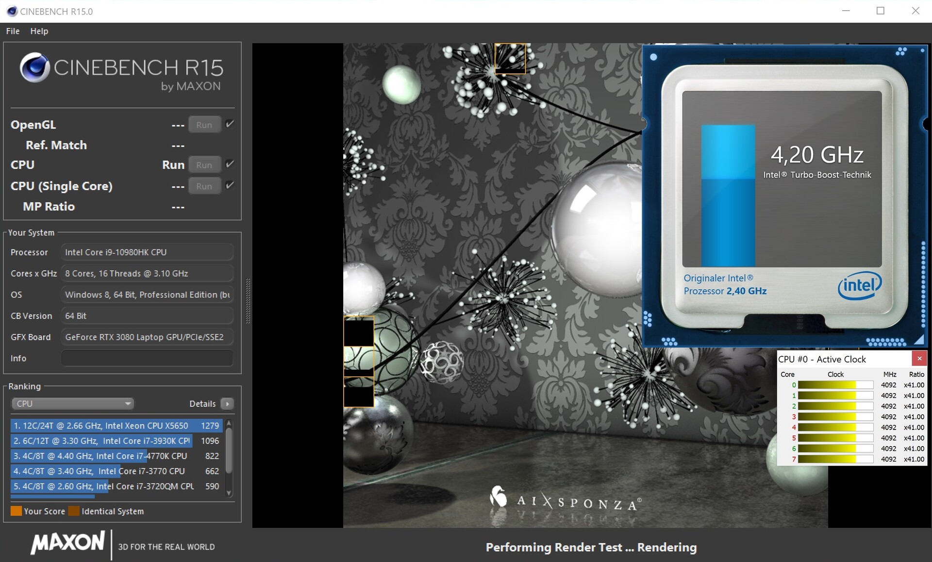 Beim verbauten Core i9-10980HK handelt es sich um ein Octacore-Modell aus Intels Comet-Lake-Generation, das noch im betagten 14-nm-Prozess entsteht (AMD fertigt im 7-nm-Verfahren). Der 45-Watt-Chip kann per Hyperthreading bis zu 16 Threads parallel bearbeiten und verfügt über einen Grundtakt von 2,4 GHz. Mittels Turbo Boost sind unter Last bis zu 5,3 GHz möglich.