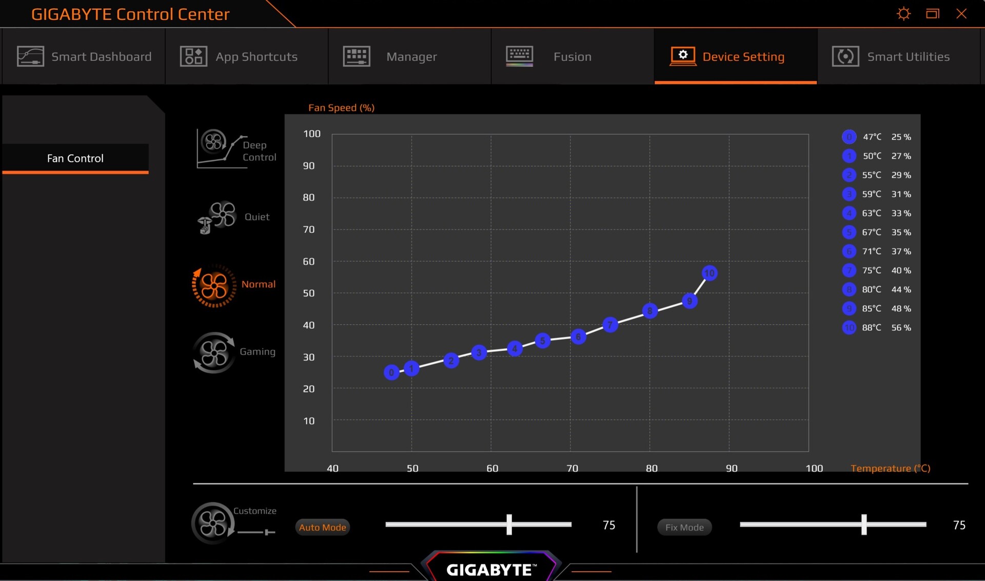 Im vorinstallierten Control Center lassen sich dutzende Einstellungen am System vornehmen – sei es nun hinsichtlich der Tastaturbeleuchtung (Per-Key RGB), der Lüftersteuerung oder der Leistungsverwaltung. Unsere Tests wurden mit dem Profil „Auto“ durchgeführt, das unter anderem die Energieoptionen selbstständig regelt. Mit Ausnahme der 3D-Benchmarks ("Gaming") befand sich die Lüftersteuerung im Modus "Normal".