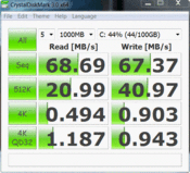 Crystal Disk Mark benutzt eine andere Routine und ermittelt ein ausführliches Bild über die Durchsätze beim Lesen/Schreiben von kleinen und großen Datenpaketen. Auffällig sind die kleinen Zahlen beim Lesen und Schreiben von verstreuten 4K Paketen (0.5 / 0.9 MB/s). Dies ist zwar typisch für rotierende HDDs aber dennoch gering. Eine schnellere 7200 U/Min HDD schafft in dieser Disziplin 0.8 / 1.7 MB/s (ST9500420AS im HP 4720s).