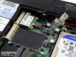 Die Unterseite kann per Wartungsklappe geöffnet werden. Hierunter befinden sich das 2.5-Zoll Laufwerk, zwei RAM-Slots (einer unbelegt), das WLAN-Modul und ein unbelegter Mini PCI-E Schacht. Letzterer lässt auf eine 3G-Version schließen, denn zwei Antennen, ein SimCard-Slot und eine 3G-Modem-Software sind vorbereitet. Die Hersteller Website spricht von einer mobilen Breitband Option (3.5G Support).