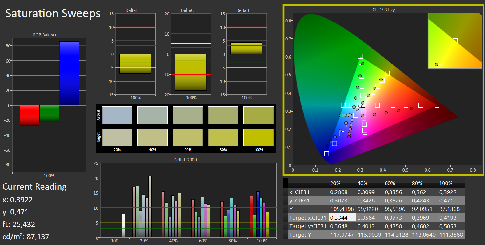 | sRGB Coverage (%) | 60.2 | 79 31% | 80.6 34% | 96.7 61% | 52.8 -12% | 94.5 57% | 84 40% | 78.1 30% |