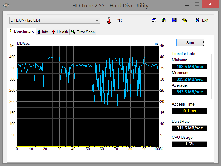 Die Leistung der SSD liegt laut CrystalDiskMark auf dem üblichen Niveau einer SATA-III-SSD mit sequentiellen Transferraten von über 500 MB/s (Lesen) bzw. 300 MB/s (Schreiben). Die zusätzliche Festplatte erreicht laut HD Tune knapp 100 MB/s, während sich die meisten Festplatten mit 7.200 U/min im Bereich von 90 MB/s bewegen.