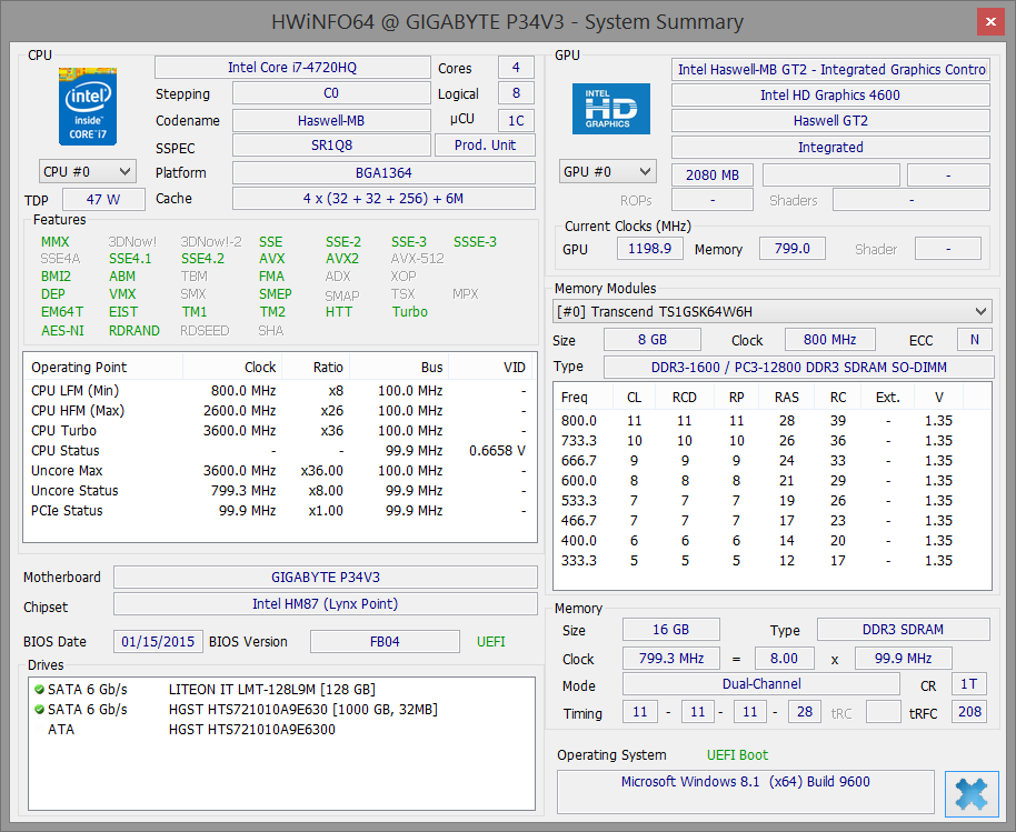 Das P34W ist ausschließlich mit einem Core i7-4720HQ-Prozessor (i7-4710HQ für Deutschland) sowie einer GTX-970M-Grafikkarte erhältlich. Im Energiesparmodus reduziert sich der Takt der Haswell-CPU auf lediglich 800 MHz, ansonsten läuft der Prozessor aber mit einem Basistakt von 2,6 GHz, der via Turbo Boost auf bis zu 3,4 GHz erhöht werden kann. Auch die Maxwell-GPU, die mittels Turbo bis zu 1.038 MHz erreicht, läuft im Energiesparmodus nur mit 135/162 MHz (Kern/Speicher). Zusätzlich kann man dank der Optimus-Technologie die integrierte HD-4600-GPU aktivieren, um den Stromverbrauch weiter zu reduzieren.