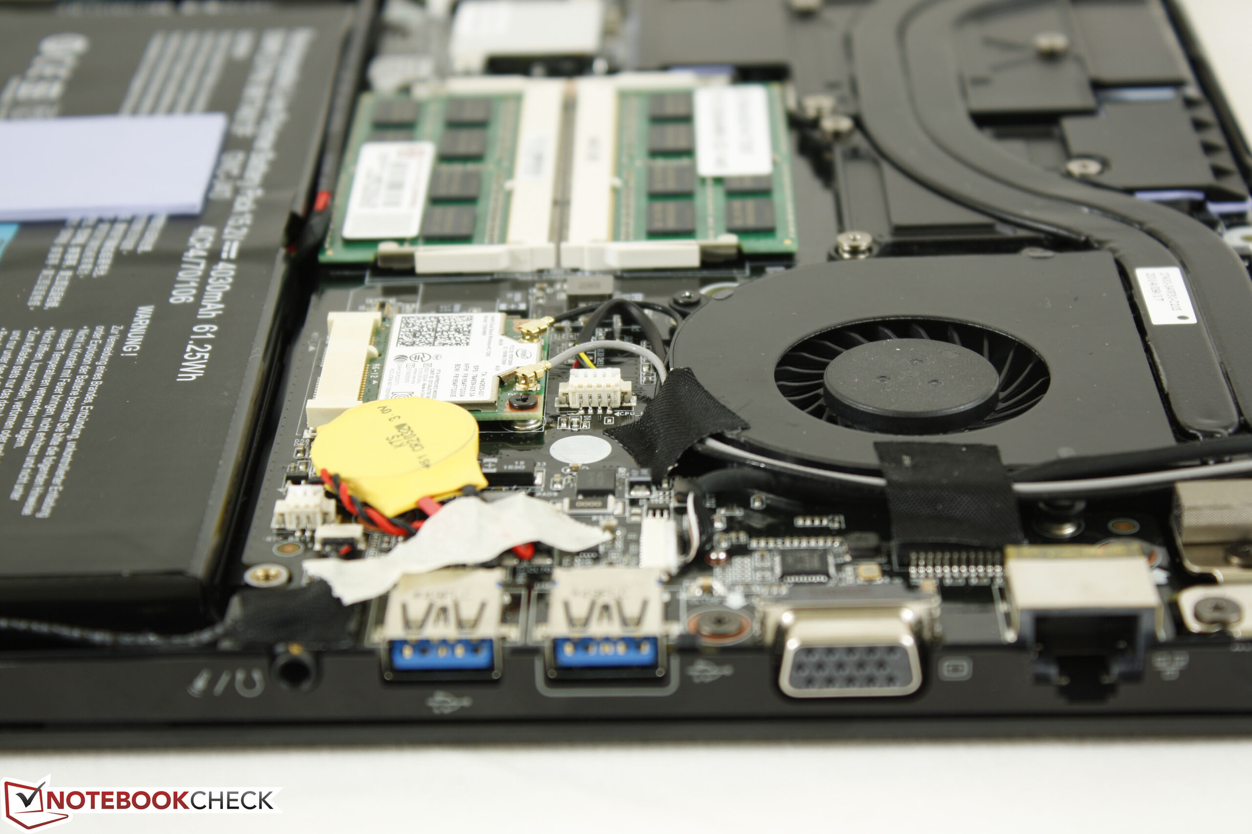 Der Arbeitsspeicher wird von zwei DDR3L-Modulen (800 MHz) von Transcend bereitgestellt. Insgesamt stehen dem Notebook 16 GB zur Verfügung. Der Arbeitsspeicher ist über eine kleine Wartungsklappe auf der Unterseite schnell zugänglich. Die gesamte Unterseite kann zudem ziemlich einfach mit einem Kreuzschraubenzieher entfernt werden, um an die Kühlung, die Festplatte, die mSATA-SSD, den Akku sowie andere Komponenten zu gelangen. Die GPU ist auf dem Mainboard aufgelötet und nicht über den MXM-3.0-Anschluss verbunden, wie es bei größeren Notebooks und Barebone-Modellen üblich ist.