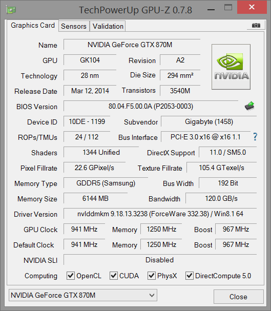 Während Büroarbeiten verrichtet die Intel HD Graphics 4600 ihren Dienst. Doch bei Spielen und in Anwendungen, welche viel Grafikpower benötigen, kommt Nvidias GPU zum Einsatz. Die Nvidia GeForce GTX 870M mit 6 GB Speicher basiert auf der Kepler-Architektur. Im Gegensatz zu Asus hat Gigabyte sein Exemplar jedoch nicht übertaktet. Es bleib beim Standardtakt von 941 – 967 Mhz. Wir haben die GTX 870M im 3DMark Fire Strike gefordert.
