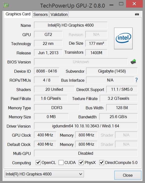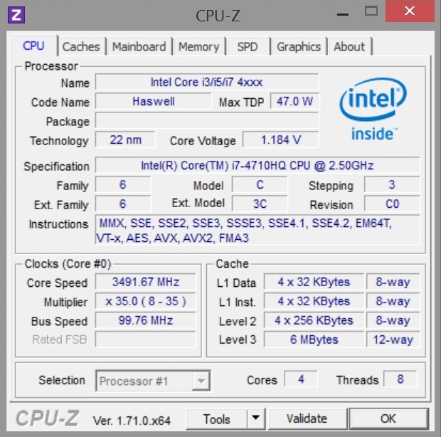 Wenig überraschend verbaut Gigabyte einen Quad-Core-Prozessor aus Intels Haswell Generation. Den 2,5-3,5 GHz schnellen Core i7-4710HQ kennen wir bereits vom (indirekten) Vorgänger. Wie die meisten seiner Brüder ist das 22-nm-Produkt mit sechs MByte L3-Cache ausgestattet. Als TDP gibt Intel 47 Watt an, was im Hinblick auf die Performance noch gerechtfertigt ist.