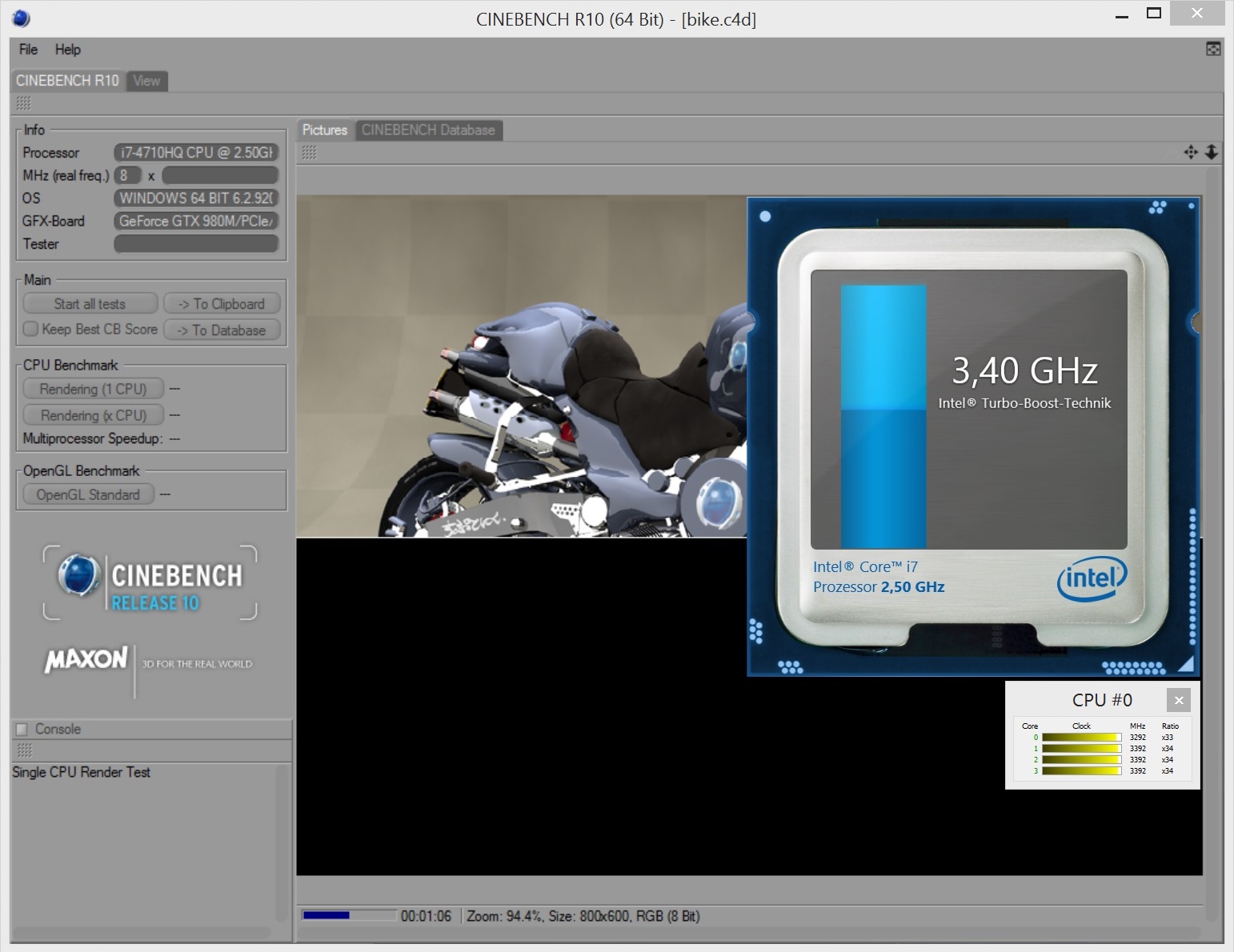 Leider erbt das P35X v3 das Phänomen des eingeschränkten Turbos. Während andere 4710HQ-Notebooks in Multi-Core-Szenarien bis zu 3,3 GHz schaffen, pendelt sich das Gigabyte auf 3,0-3,2 GHz ein, wobei der Takt in 3D-Anwendungen manchmal auf 2,5-3,0 GHz fällt. Hin und wieder lässt sich sogar ein kurzfristiges Throttling beobachten (einzelne Kerne rutschen für Sekundenbruchteile unter den Basiswert). In reinen Prozessor-Benchmarks ist der Turbo Boost hingegen immer aktiv.