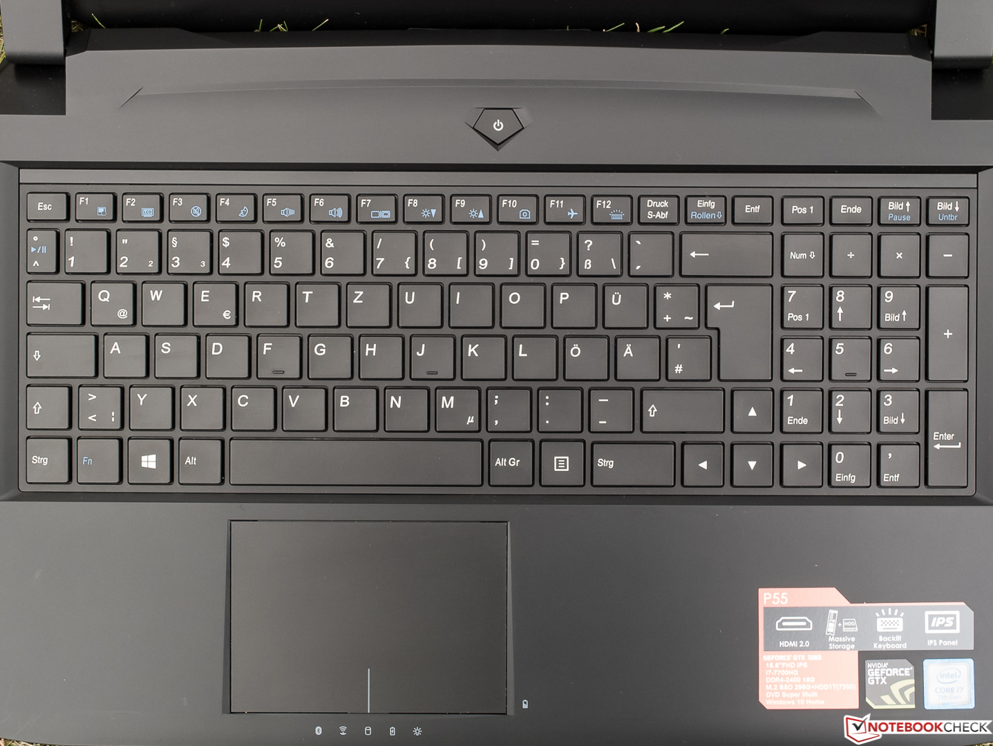 An der zweistufig beleuchtbaren Chiclet-Tastatur hat Gigabyte seit dem P55W v4 nichts verändert - und das ist auch gut so. Die Breite des Hauptfeldes entspricht in etwa dem eines Standard-Desktop-Keyboards, Tastengrößen und -abstände stehen Zehn-Finger-Akrobaten nicht im Weg. Auf dedizierte Makrotasten oder eine bei größeren Gaming-Notebooks übliche Extra-Tastaturspalte mit Spezialfunktionen hat der Hersteller verzichtet. Überraschungen hält das weitgehend standardkonforme Layout nicht bereit.