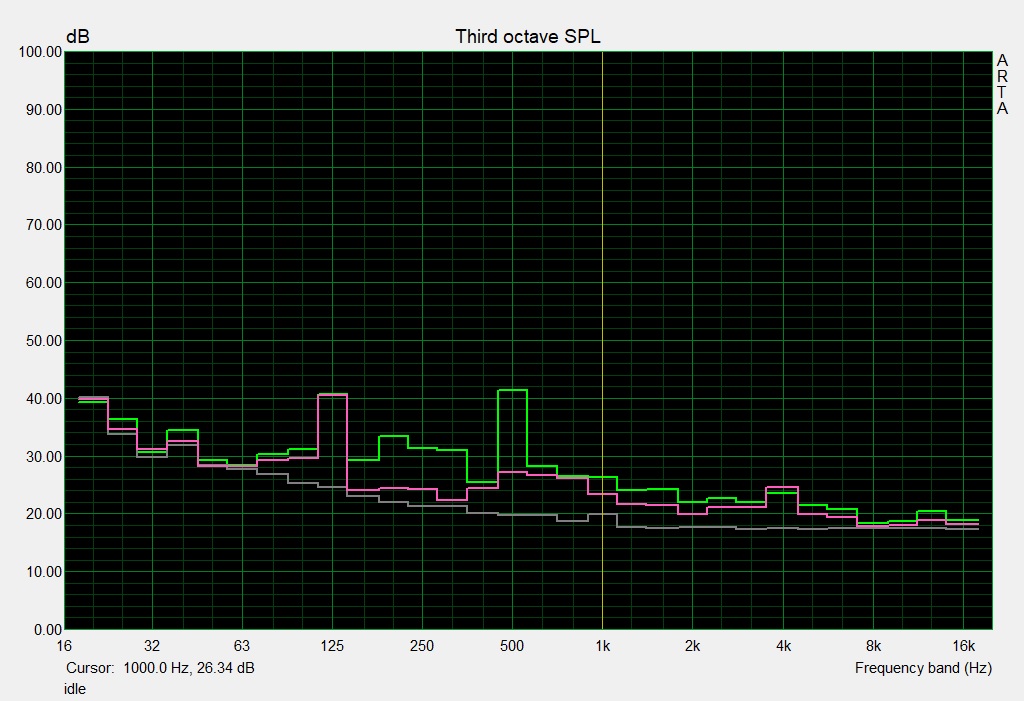 | Idle avg * (dB) | 35 | 36 -3% | 34 3% | 33.1 5% | 30.9 12% | 33 6% |
