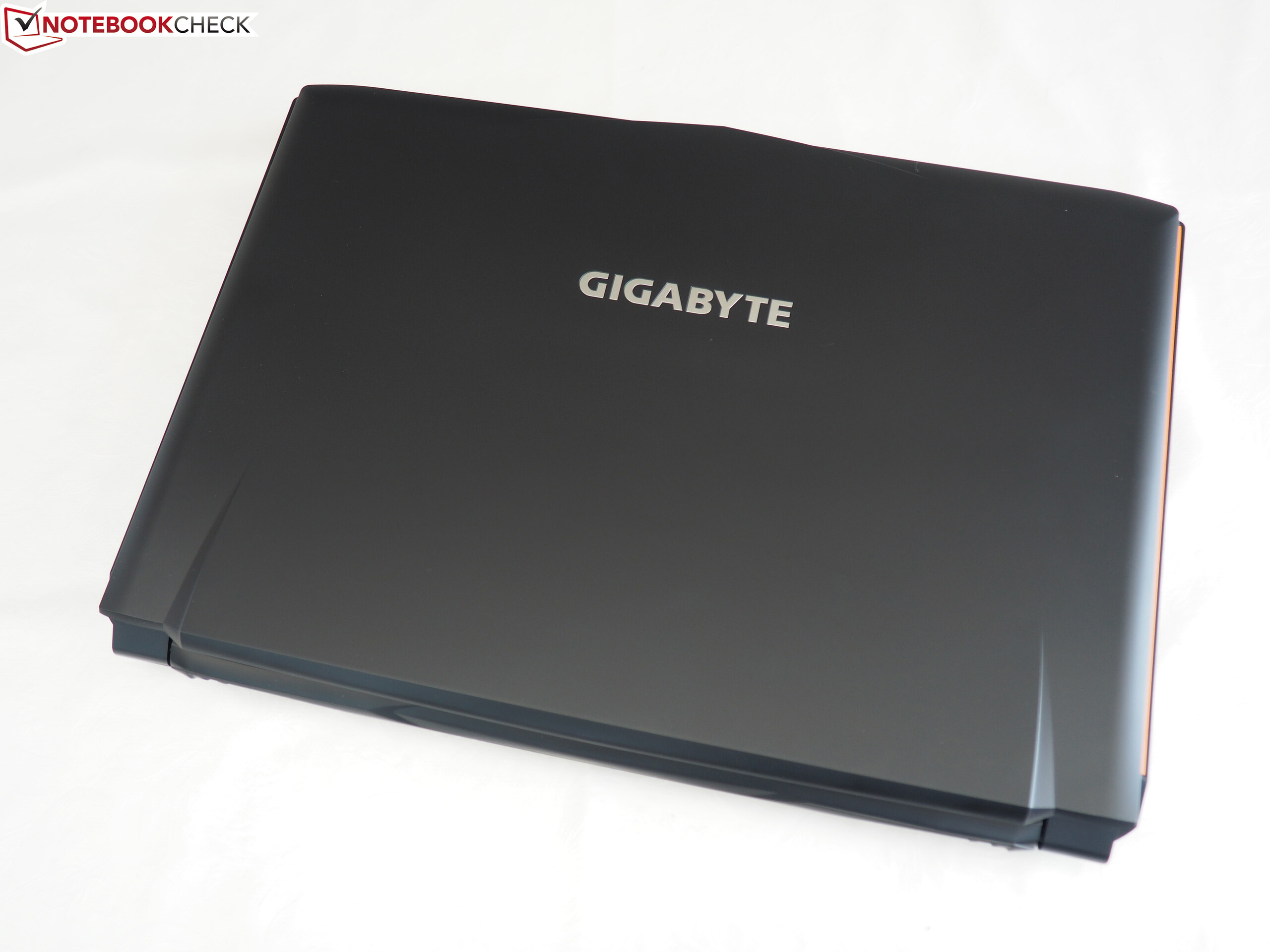 Das Gewicht siedelt sich mit 2,67 kg ebenfalls im Mittelfeld an. Summa summarum können wir dem P56XT eine akzeptable Transporttauglichkeit bescheinigen. Ob man das markante Design zu schätzen weiß, hängt wie immer vom persönlichen Geschmack ab. Durch die orangefarbenen Linien an der linken bzw. rechten Seite (welche durch den Deckel nicht verdeckt werden) und die orange markierten Scharniere setzt Gigabyte jedenfalls Akzente.