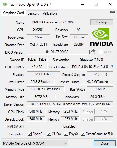 Ansonsten kann das DirectX-12-Modell mit einem 3 GByte großen GDDR5-Speicher plus 192-Bit-Interface auftrumpfen. Jedoch sollte man erwähnen, dass manch ein Hersteller der GTX 970M 6 statt 3 GByte VRAM verpasst. Einige Spiele (z. B. Call of Duty Black Ops 3, Rise of the Tomb Raider & Hitman) benötigen für maximale Settings und/oder Auflösungen ab FHD mindestens 4 GByte.