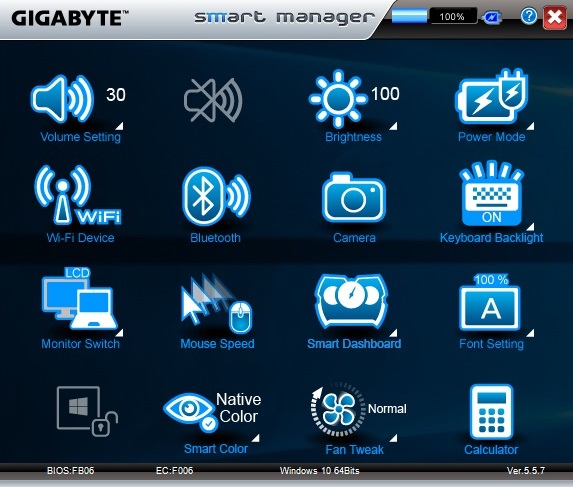 Als primäre Anlaufstelle wäre der Smart Manager zu nennen. Hier entdeckt man zahlreiche Komfortfunktionen, die sich bisweilen auch per Tastenkombination aktivieren lassen (Lautstärke, Helligkeit, Webcam, ...). Fortgeschrittene Nutzer dürfen sich sogar der Lüftersteuerung und der Bildschirmfarbe widmen. Unser Display-Test basiert auf dem Standard-Setting Native Color. Die Lüfteroption Fan Tweak wählten wir jeweils passend zum aktuellen Szenario (Quiet für Idle, Gaming für Last).