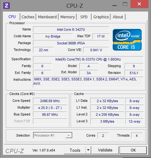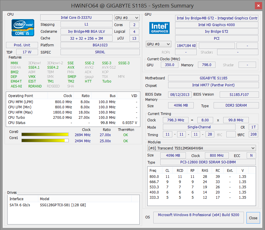 Das S1185 wird von einem Core i5-3337U angetrieben. Dieser Zweikerner entstammt der Ivy-Bridge-Prozessorgeneration. Er arbeitet mit einer Basisgeschwindigkeit von 1,8 GHz. Per Turbo kann die Geschwindigkeit auf 2,5 GHz (beide Kerne) bzw. 2,7 GHz (nur ein Kern) erhöht werden.