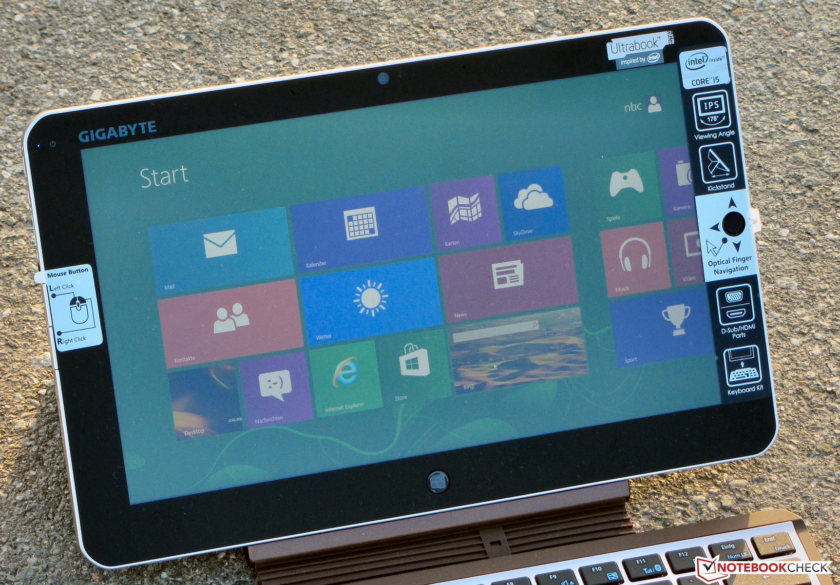 Der Touchscreen gibt keinen Grund zur Klage: Er reagiert prompt auf Eingaben. Gigabyte setzt ein kapazitives Touch-Panel ein. An der linken Seite des Tablets findet sich eine separate Taste, mit der das automatische Drehen des Bildschirminhalts ein- und ausgeschaltet werden kann.