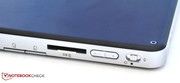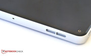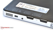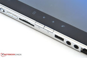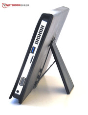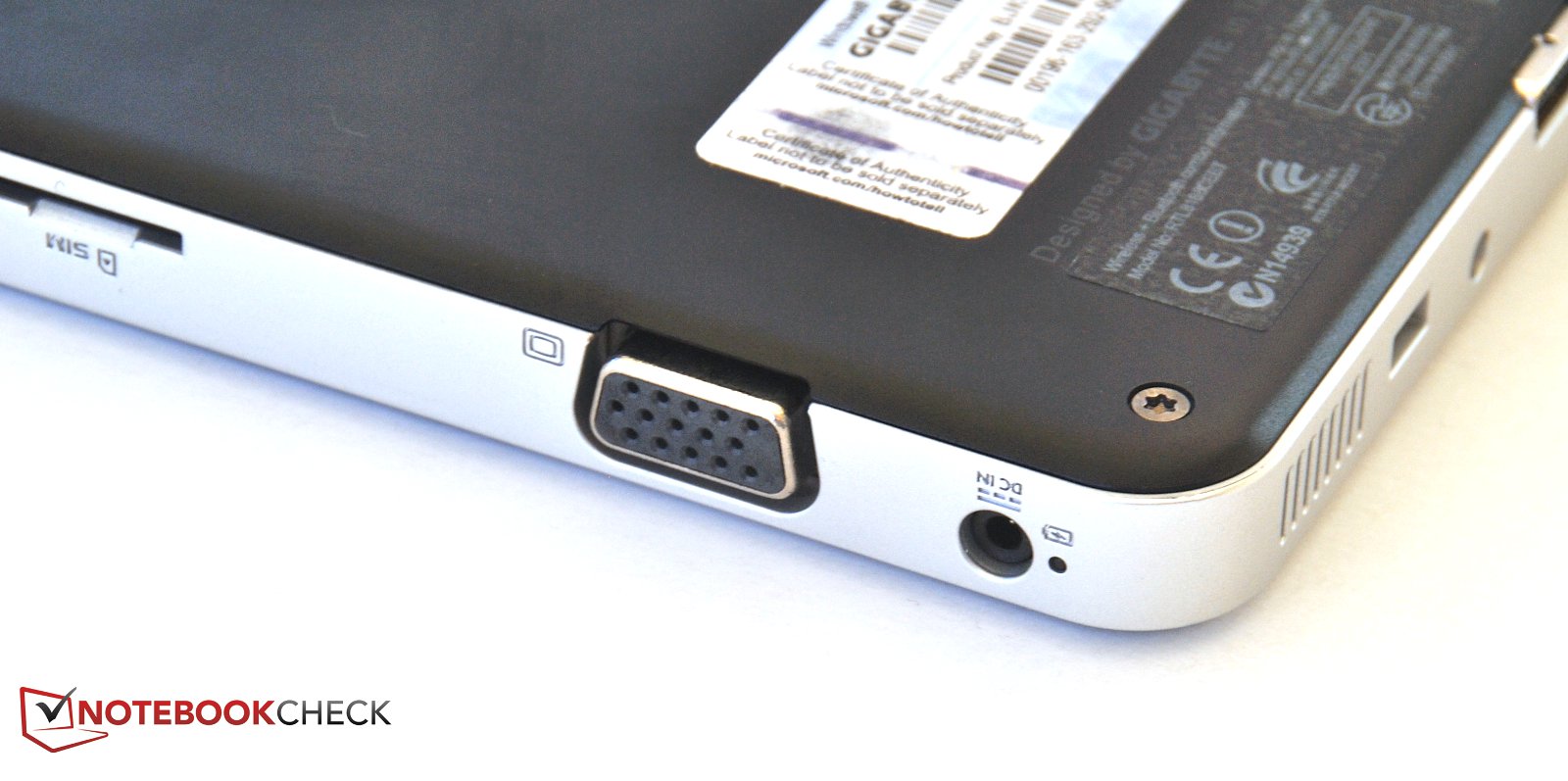 Was die Anschlüsse angeht, ist das Gigabyte S1080 gut ausgestattet. Es bietet einen USB 3.0 und einen powered USB 2.0 Anschluss. Letzterer versorgt das angeschlossene USB-Gerät auch mit Strom, wenn das Tablet ausgeschaltet ist. Neben diesem befindet sich ein Kopfhörer- und ein Mikrofon-Anschluss. Auch Gigabit-LAN hat am dicken Gehäuse noch Platz gefunden, und zwar in der linken unteren Ecke. Der SD-Karten-Leser sitzt zwischen den Mausersatztasten und der Lautstärketastenwippe. Ein externer Monitor kann über VGA angeschlossen werden.