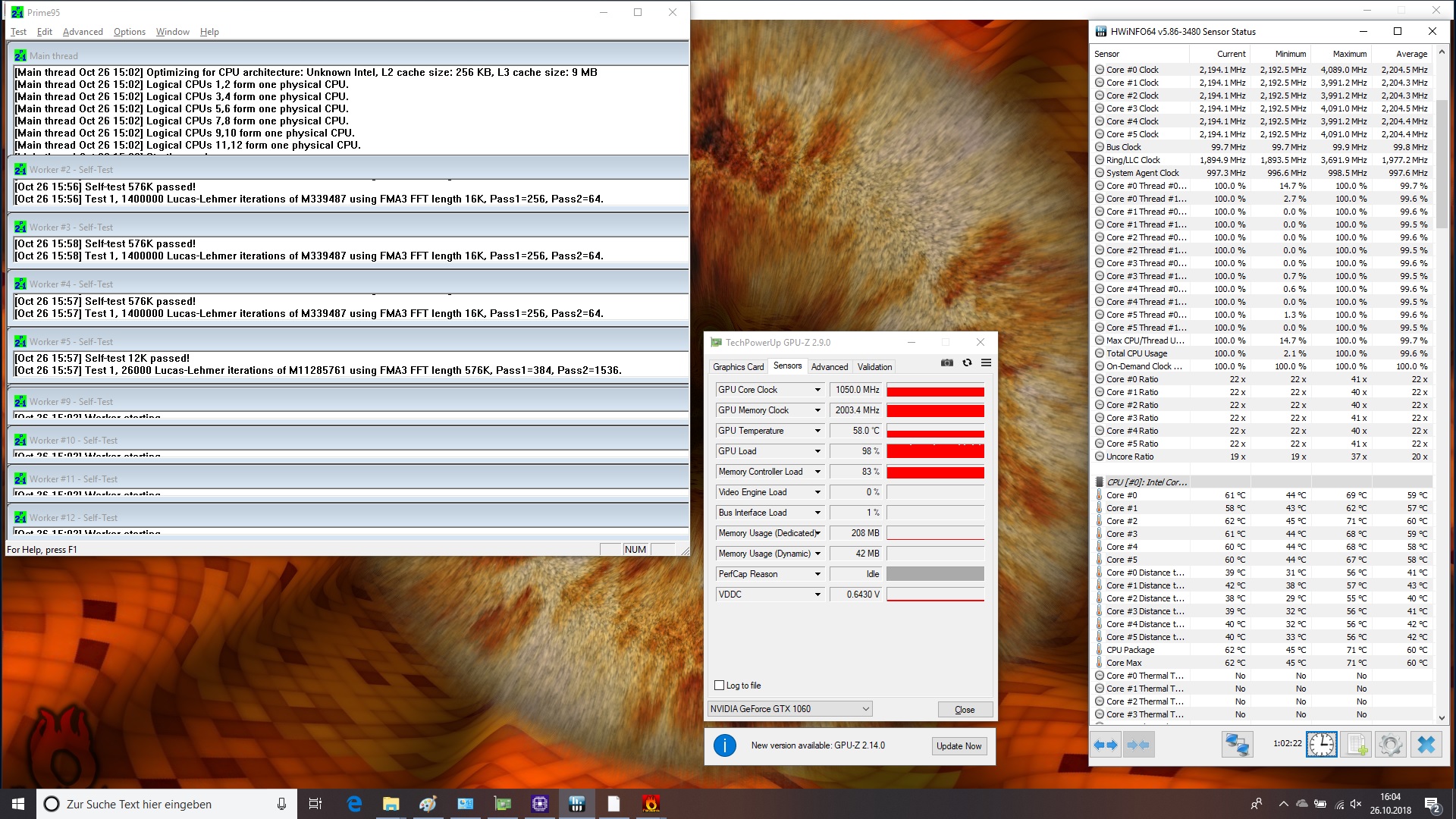 Unser Stresstest für mindestens 1 Stunde zeigt, dass die CPU- und GPU-Temperaturen recht konstant auf etwa 60 Grad gekühlt werden. Dadurch taktet die CPU gerade noch so mit ihrem Basistakt, der Chiptakt der GPU beträgt 1050 MHz. Diese Drosselungen machen sich auch im 3D-Betrieb bemerkbar. Lässt man den 3DMark 11 direkt nach dem Stresstest noch einmal laufen, so kommt das Sabre nur noch auf etwa 5.000 statt 12.000 Punkte. Dafür bleiben die Temperaturen des Geräts stets im moderaten Bereich.