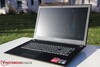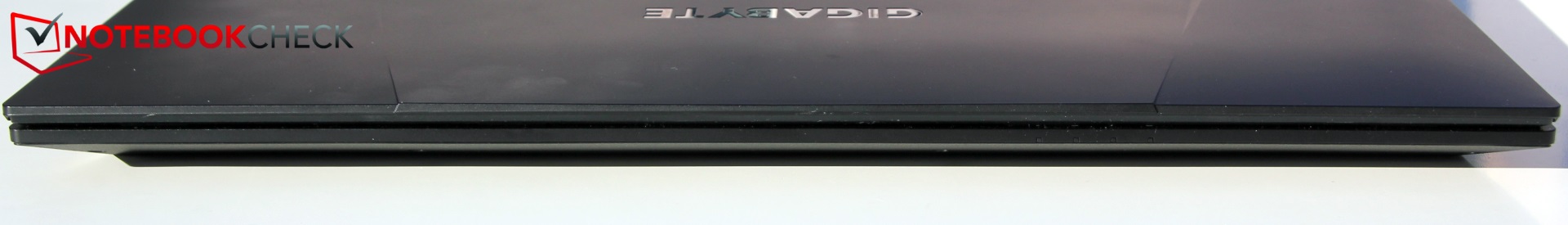 Das Display reagiert optisch recht empfindlich auf Verwindungen und Druck auf den Displaydeckel. Auf dem Displaydeckel prangt der silberne Gigabyte-Schriftzug, zudem ist die Oberseite nicht eben, sondern hat aus Designgründen eine Art Einbuchtung. Der Bildschirm selbst hat relativ breite Ränder, im oberen Bereich sitzen Kamera und Mikrofon, unten ziert ein weiterer Gigabyte-Schriftzug den Rand.