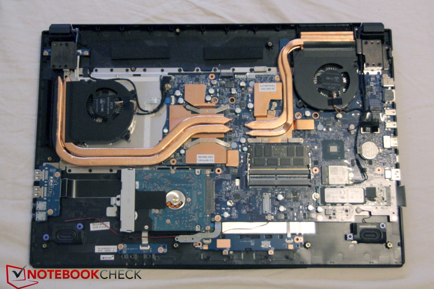 Über eine Wartungsklappe verfügt das Sabre 17 nicht, man muss also die Bodenplatte entfernen. Größtes Hindernis beim Abnehmen der Unterseite ist die Anzahl der vorhandenen Schrauben. Mit gleich 16 Kreuzschlitzschrauben ist die Platte gesichert, hinzu kommen noch diverse Plastikhaken im Gehäuseinneren. Hat man das zeitaufwändige Unterfangen erfolgreich hinter sich gebracht, so erhält man Zugriff auf beide Laufwerksschächte, die RAM-Slots sowie das WLAN-Modul.