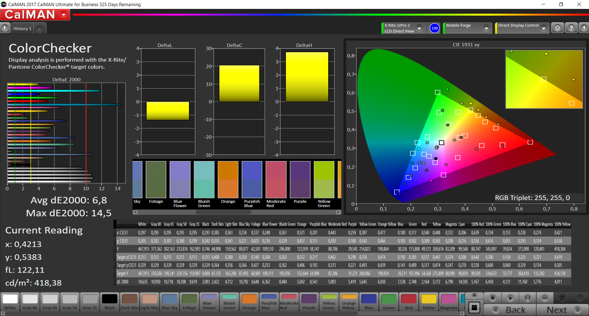 | Delta E Colorchecker * | 6.8 | 2.83 58% | 4.9 28% | 4.6 32% | 4.5 34% | 5 26% | 1.7 75% |