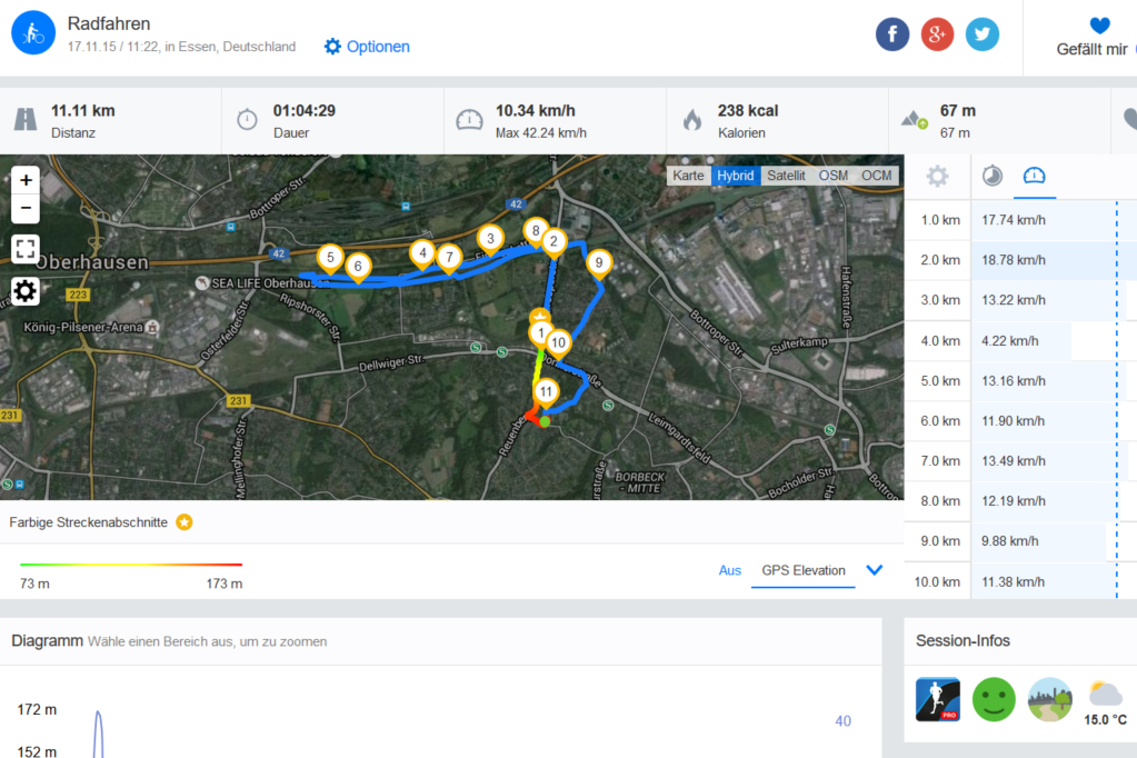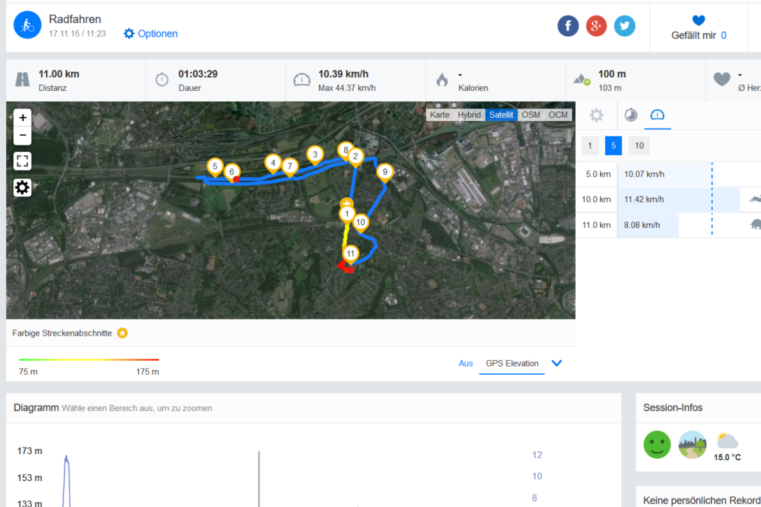 Das GPS-Modul des Nexus 5X findet im Freien sehr zuverlässig und schnell die aktuelle Position, im dritten Stockwerk eines Wohngebäudes mit insgesamt vier Etagen war allerdings keine Ortung möglich. Um herauszufinden, wie sich das Testgerät in der Praxis schlägt, haben wir eine Strecke zu Vergleichszwecken mit dem GPS-Fahrradcomputer Garmin Edge 500 und dem Nexus 5X parallel aufgezeichnet. Hier kann das Smartphone überzeugen: Sowohl die Abweichung zwischen beiden Geräten von lediglich einem Prozent als auch die präzise Nachzeichnung des gefahrenen Weges sprechen für eine sehr gute Leistung des Google Referenzmodells. Zwar erfasst es nicht die kleine Kreisfahrt in der Nähe des Wendepunktes, im Gegenzug stimmt der Streckenverlauf in diesem Bereich jedoch etwas genauer als der des Fahrradcomputers mit den Kartendaten überein. Für Navigationszwecke ist das Nexus 5X somit hervorragend geeignet.
