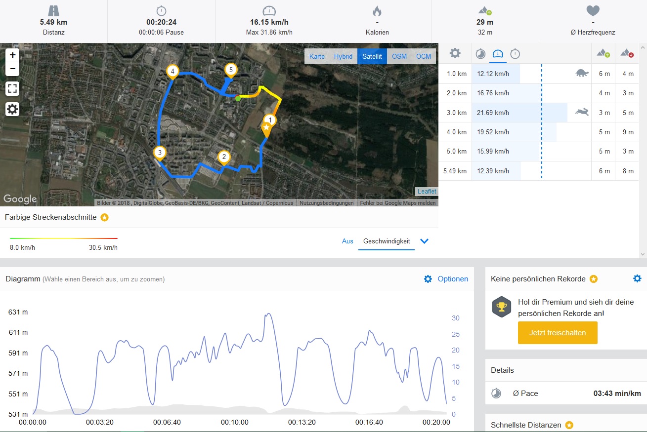 In der Praxis testen wir die Ortungsgenauigkeit natürlich ebenfalls und nehmen das Profi-Navi Garmin Edge 520 auf eine Radtour mit, bei der auch das Google Pixel 3 XL mitfährt. Dabei schlägt sich das Pixel-Phone allerdings eher mäßig: Es kürzt gefahrene Kurven gern ab, wie es im Ausschnitt der Durchfahrt durch das kleine Wäldchen zeigt. Bei der Anfahrt und der Querung der Brücke allerdings zeigt das Smartphone recht große Schwächen: So wird die falsche Straßenseite für den Anfahrtsweg angezeigt, die Brückenüberquerung fast komplett ignoriert und an der Kreuzung eine Ampel ausgelassen. Mit dem Google Pixel 3 XL lässt es sich ordentlich navigieren, auch weil die Ortung in Google Maps sehr flott und exakt vonstatten geht und der Kompass die richtige Richtung anzeigt. Wer aber oft in unwegigem Gelände unterwegs ist und exakte Standorte benötigt, der sollte sich nicht zu sehr auf das Smartphone verlassen.