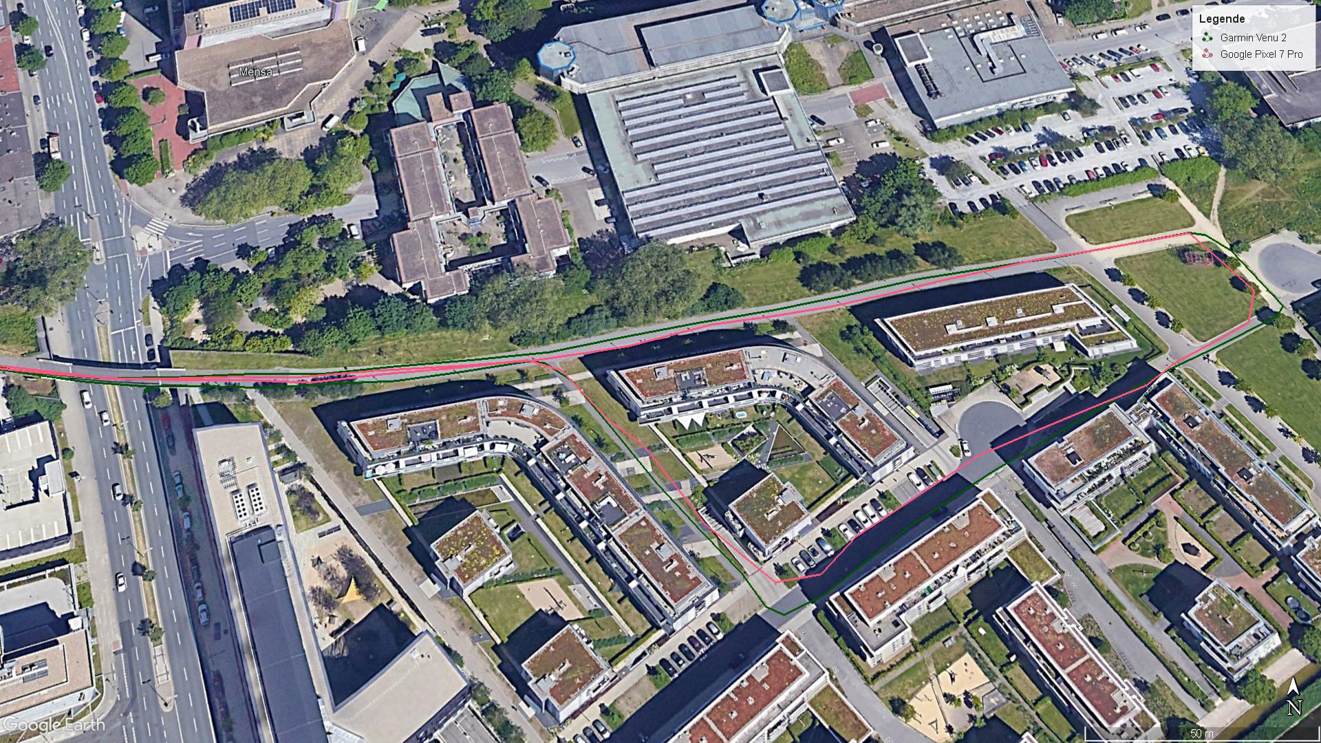 Auf einer kleinen Tour mit dem Fahrrad muss sich das Pixel dem Vergleich mit der Fitness-Smartwatch Garmin Venu 2 stellen. Dabei zeigt sich eine recht ordentliche Streckenverfolgung, welche jedoch nicht so akkurat ist wie die der Garmin-Uhr. Für Navigationsaufgaben ist die gebotene Leistung jedoch absolut befriedigend.