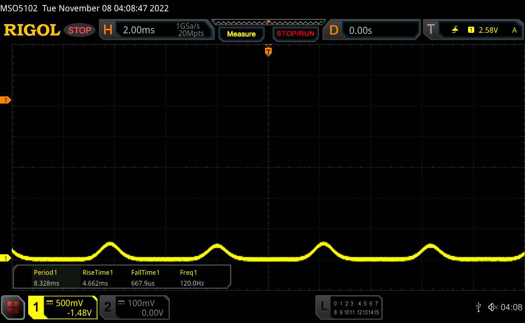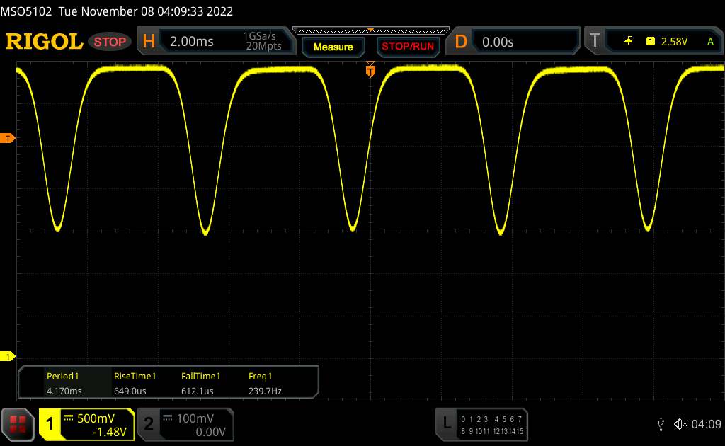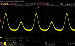 Bei der Messung mit dem Oszilloskop können wir ein Flackern des OLEDs feststellen, welches bei geringer Leuchtkraft jedoch sehr konstant ausfällt und sich mit 120 Hz auf Höhe der Bildwiederholrate bewegt. Wird das Display heller, steigt die Frequenz sprunghaft auf stabile 240 Hz an. Der Effekt wird mit einem dauerhaften DC-Dimming vergleichbar sein, weshalb die Wahrscheinlichkeit für Beschwerden geringer ausfällt als mit Displays, die einen unruhigeren Periodenverlauf besitzen.