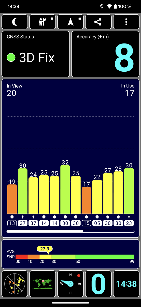 Die Positionsbestimmung des Google Pixel 7 Pro erfolgt per Dual-Band-GNSS über die Satellitennetzwerke GPS, Glonass, Galileo, QZSS und BeiDou. Der Satfix gelingt im Freien sehr schnell und genau, in Gebäuden dauert es länger und das Smartphone benötigt etwas Zeit, um sich auf eine brauchbare Genauigkeit einzupendeln.