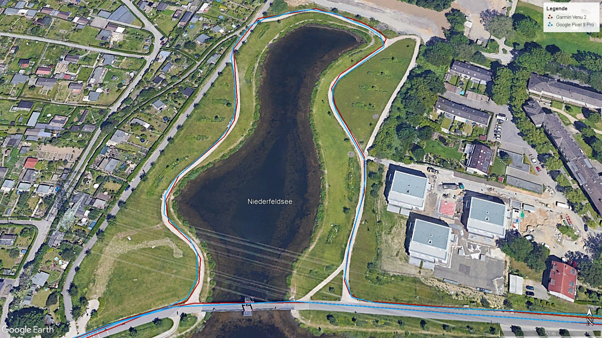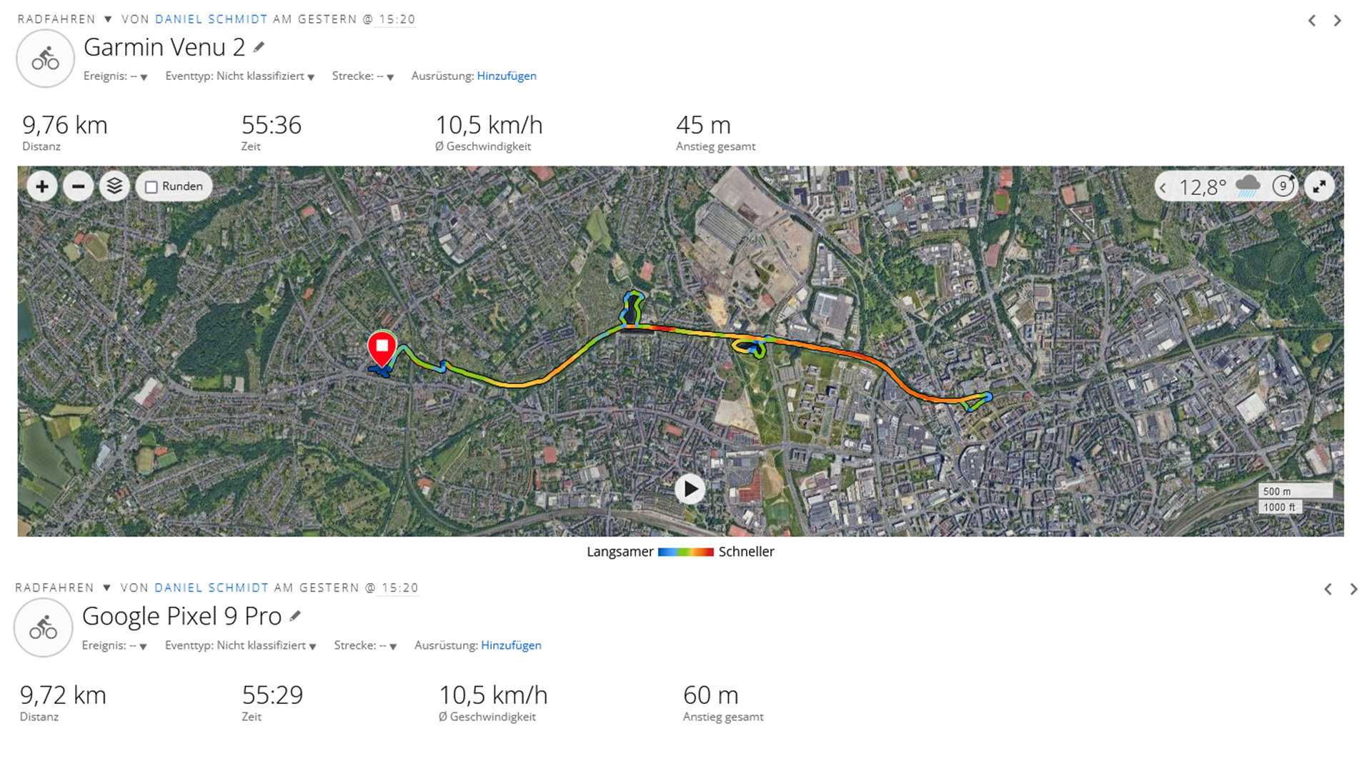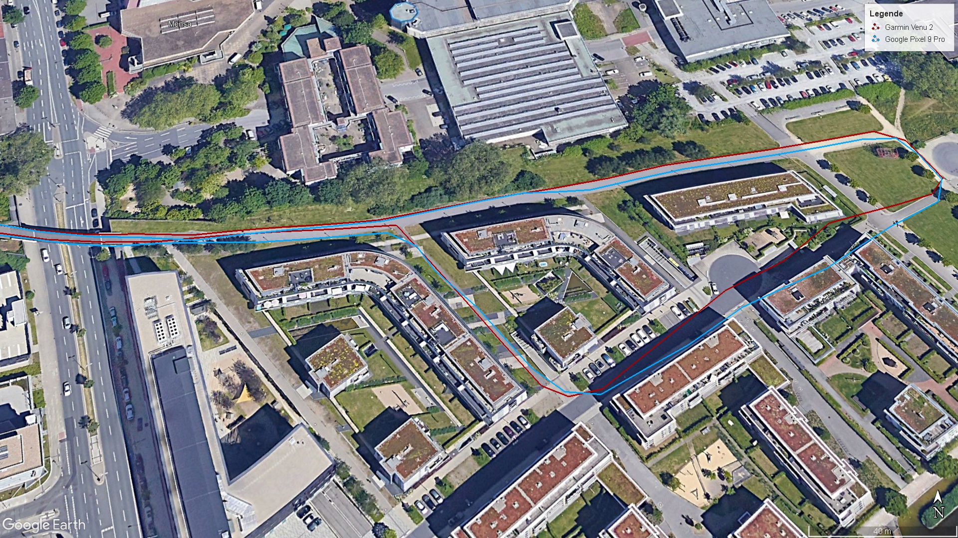 Mit Hilfe von Dual-Band-GNSS und allen globalen Satelliten-Navigationsdiensten bestimmt das Pixel 9 Pro seine aktuelle Position. Im Vergleich mit der Fitness-Smartwatch Garmin Venu 2, die als Referenzgerät dient, ist die Ortung zwar nicht immer ganz exakt, für den Alltag aber völlig ausreichend.