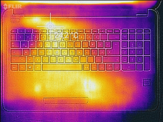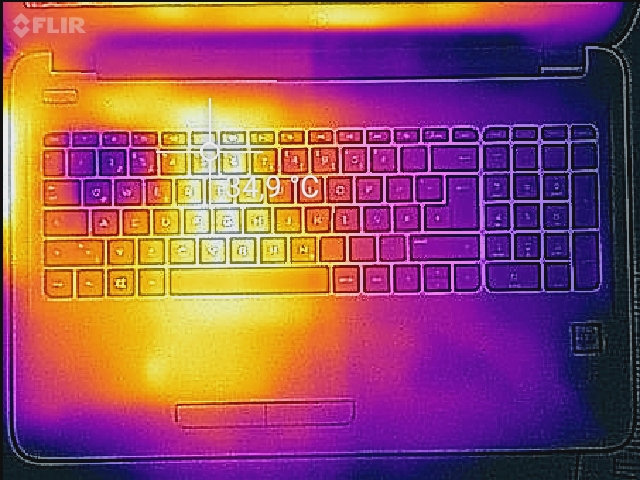Unseren Stresstest (Prime95 und Furmark laufen für mindestens eine Stunde) durchläuft das HP 15 im Netz- und im Akkubetrieb auf die gleichen Weisen. Der Prozessor arbeitet nur wenige Sekunden mit 3 GHz. Dann wird die Geschwindigkeit auf 2,3 bis 2,5 GHz gesenkt. Der Grafikkern geht immer mit voller Kraft (1.000 MHz) zu Werke. Unser Stresstest stellt ein Extremszenario dar, welches so im täglichen Betrieb nicht auftritt. Im Alltagsbetrieb arbeitet der Prozessor mit voller Kraft. Mit einer Reduzierung der Geschwindigkeit, wie sie in unserem Stresstest auftritt, ist nicht zu rechnen. Sonderlich stark erwärmt sich der Rechner während des Stresstests nicht. An allen Messpunkten liegen die Temperaturen klar unterhalb von 40 Grad Celsius.